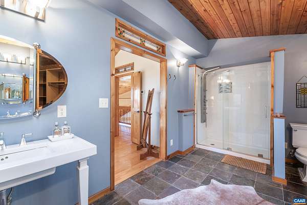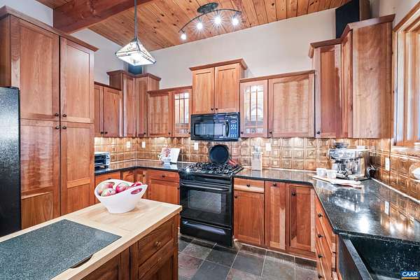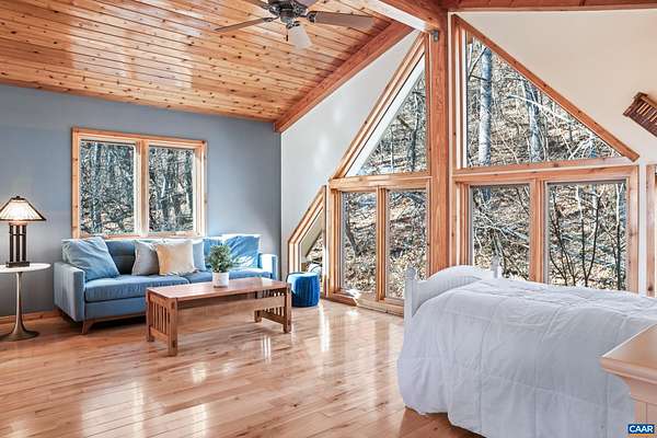 A NEWLY PAVED DRIVEWAY leads up to this stunning post & beam mountain home on private woodland parcel with VIEWS! Welcome to Yamanaka, meaning "In the mountains". Total PRIVACY with wildlife neighbors yet just MINUTES FROM CROZET restaurants, shopping, wineries & breweries. Find BEAUTY INSIDE & OUT where the home itself is a work of art, from handsome wood floors to pine board ceilings & impressive posts & beams. ZERO CARPET. Custom lighting throughout. CHEF'S KITCHEN has gas range, soapstone counters, copper backsplash, mood lighting, and opens to screen porch & dining area. A great room with SOARING CATHEDRAL CEILING features a wall of glass overlooking mountains and woodland. Main level home office is pitch perfect - FIBER OPTIC inbound shortly! Even the staircase will impress as it leads to COZY LOFT and spacious upstairs owner's suite w gorgeous views, large custom bath and cedar WIC. But wait there's more! Extensive terrace level includes a fabulous REC ROOM w/ custom bar, bookcases and access to deck with HOT TUB! Also on the terrace level, find an ensuite BR/bath with access to the outdoors as well as a third BR w/ Murphy bed and secret bookcase door! Nearly new HVAC. VACATION YEAR ROUND!