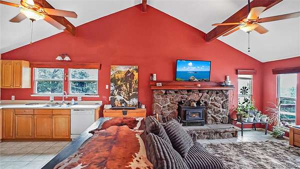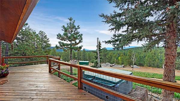 This charming 2-bedroom, 1-bath retreat in Deer Creek Valley Ranchos offers breathtaking views of the surrounding mountains and a taste of the ultimate Colorado lifestyle. The home features a sleek, efficient kitchen and a cozy living room with a striking stone fireplace and wood-burning insert. Pitched ceilings with exposed beams add character and warmth. Step through French doors from the primary bedroom onto a spacious deck—perfect for morning coffee or evening stargazing. Below, unwind in the hot tub as you take in the natural beauty from all directions. The primary bedroom also offers a generous walk-in closet for your personal storage needs. Outside, you'll find nearly 5 acres covered with Aspen and pine and a detached 2-car garage for added storage and workspace. There's plenty of space for horses and room to park your motorhome and equipment. You'll also find a fenced chicken coop and unusual rock outcroppings. Whether you're seeking a peaceful getaway or a full-time residence immersed in nature, this property delivers a rare blend of privacy, functionality, and mountain charm. View the pictures and virtual tour and call today for your personal showing!