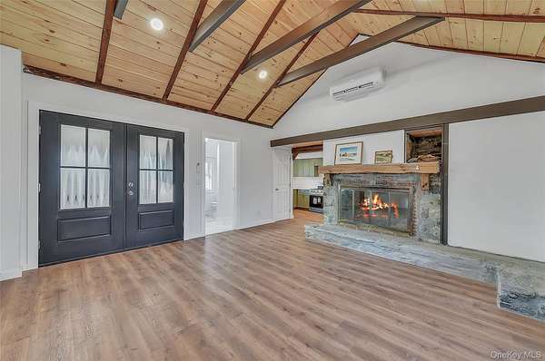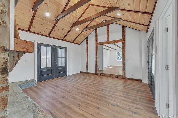 Modern Elegance Meets Rustic Charm on 2 Park-Like Acres..Step into this breathtaking, fully renovated Cape Cod where timeless character meets contemporary luxury. The heart of the home features soaring cathedral ceilings anchored by exposed wood beams and a beautiful stone fireplace, creating an atmosphere of warmth and grandeur. Gleaming wood floors flow throughout the open layout, leading to a chef-inspired kitchen equipped with premium stainless-steel appliances. Retreat to the convenience of a first-floor primary suite, complete with a private, spa-like full bath. Upstairs, additional bedrooms offer comfort and style for family or guests alone with a nicely sized full bathroom. Outside, your private 2-acre oasis awaits, featuring manicured, park-like grounds and a massive 30x50 two-story barn-perfect for a workshop, car collection, or ultimate studio space. Every inch of this home has been meticulously updated, offering a turnkey lifestyle in a serene setting.