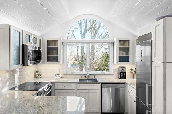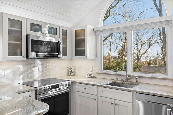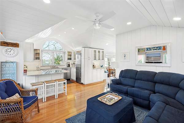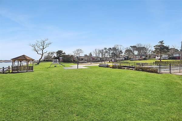 Indulge in the quintessential Hampton lifestyle at this exquisite, secluded waterfront seasonal cottage community overlooking the breathtaking Great Peconic Bay. Escape the hustle and bustle of urban living and immerse yourself in a tranquil summer haven while you work remotely from home. Your children can safely frolic in the enclosed landscaped grounds and enjoy the playground. Experience the epitome of a Hampton's summer as you unwind on your private beach, glide along the bay in your tandem kayak, take a refreshing dip in the sparkling pool, or unwind in the gazebo while witnessing awe-inspiring sunsets. For the sports enthusiasts, there are pickleball and tennis courts, as well as a basketball hoop perched atop the bluff. This charming cottage has been meticulously renovated inside and out, boasting an open-concept design, elegant shiplap walls, new windows, central air/heat, a modern stainless steel kitchen adorned with granite countertops and a marble/shell backsplash, oak flooring throughout, a cozy dining area, two inviting bedrooms, and a luxurious marble/granite bathroom. Step outside onto the expansive brick patio, complete with access to ample storage behind the foundation walls. Pets are warmly welcomed, and private and guest parking are readily available. Laundry facilities are conveniently located on the premises. With Board approval, the cottage can be expanded by up to 25%. Situated close to a myriad of restaurants, art galleries, and boutique shops, this is an opportunity not to be missed. Don't let this chance slip away-make this slice of the Hamptons yours today!, Additional information: ExterioFeatures:Tennis,Interior Features:Lr/Dr,Marble Bath