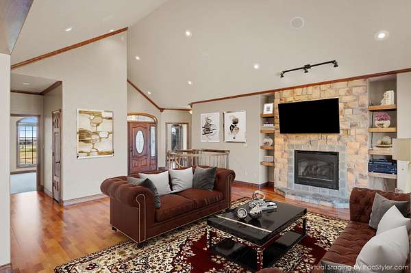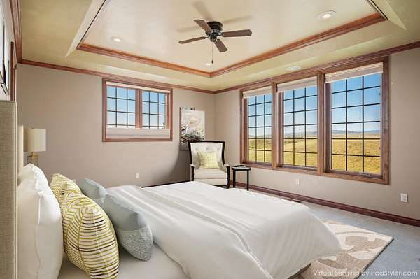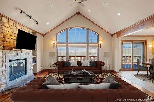 This 2.6 acre luxurious property features everything you need on the main level-- a spacious living room with gas fireplace, gourmet kitchen, a luxurious master suite with jetted tub, and the laundry room, which connects to the heated & finished 2,021 SQFT 4 car shop/garage with 14 FT ceilings. Also on the main level are two additional bedrooms and an office that can serve as another bedroom. The south facing towering windows of the living area overlook the deck and offer stunning sunsets and mountain views. The lower level features 10 FT ceilings, lots of natural light, a spacious family room with wet bar and gas heating stove, and a guest suite with nicely tiled shower. The basement walks out to a patio with hookups for your hottub.