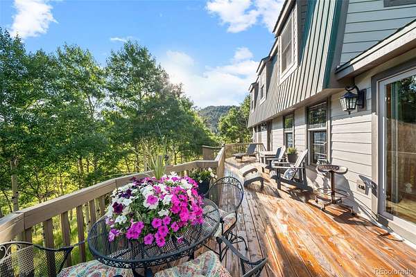 Tucked away on 2.75 acres and bordering the Arapaho National Forest, 67 Thistle Trail is a fully remodeled mountain retreat that blends refined comfort with Colorado adventure. Nearly 3,000 sq ft of living space includes four bedrooms, two and a half bathrooms, a wine room, cozy fireplace in the living room, wood-burning stove in the kitchen, and expansive decks for relaxing under the stars. The open-concept kitchen offers a large island, gas stove, and double oven, while the finished basement adds a bonus room and fourth bedroom for guests. An oversized 2-car garage with workshop, large laundry/utility room, and zoned heating add convenience. Surrounded by mature aspens, fall here is especially breathtaking.