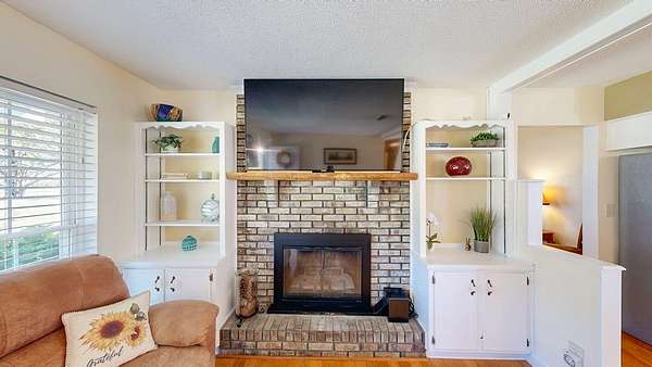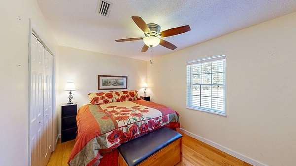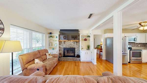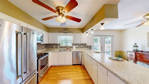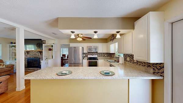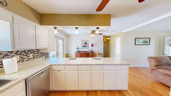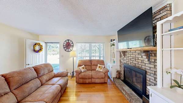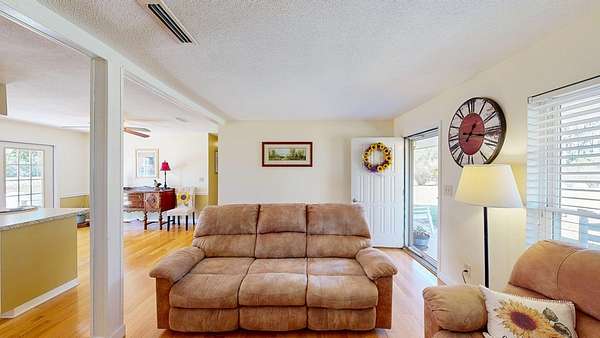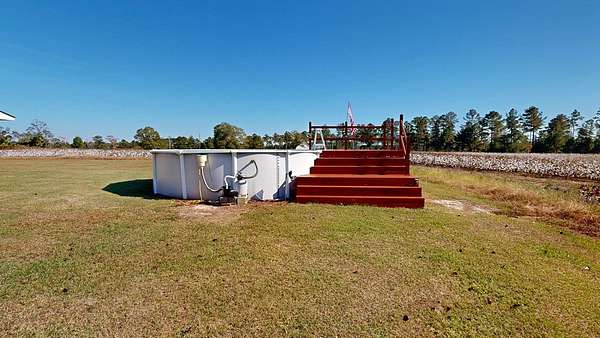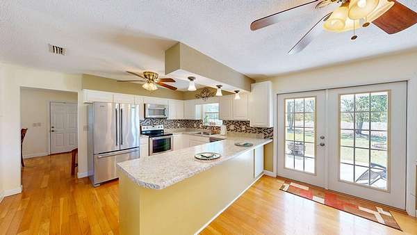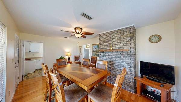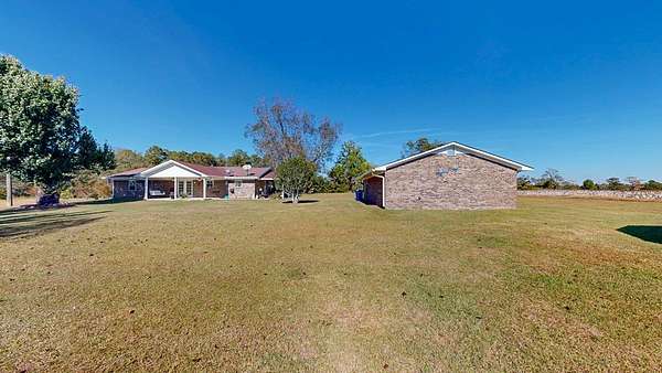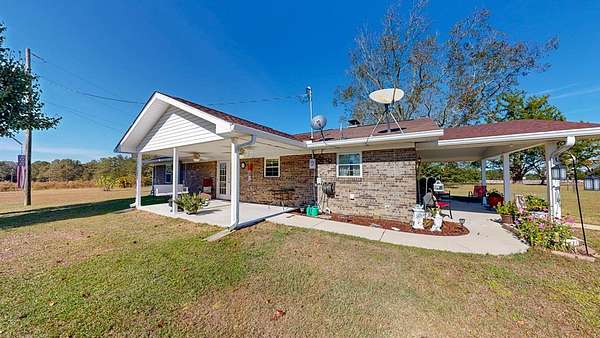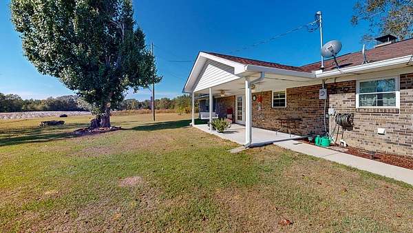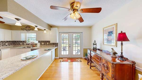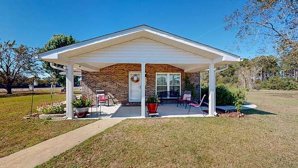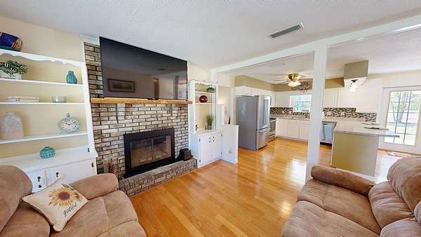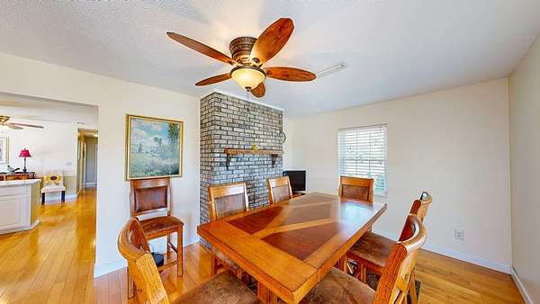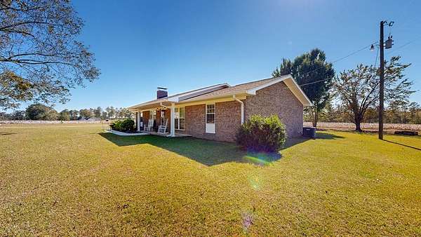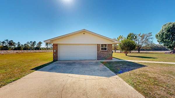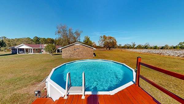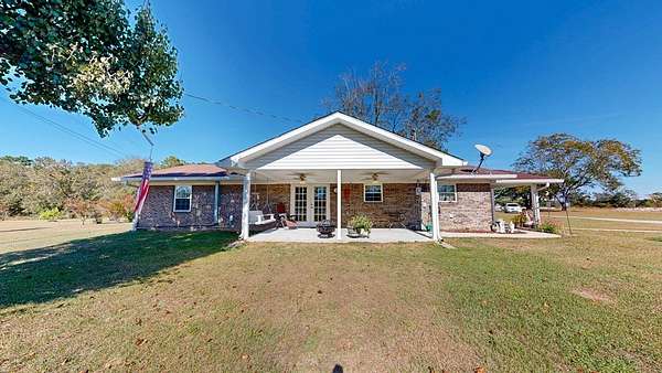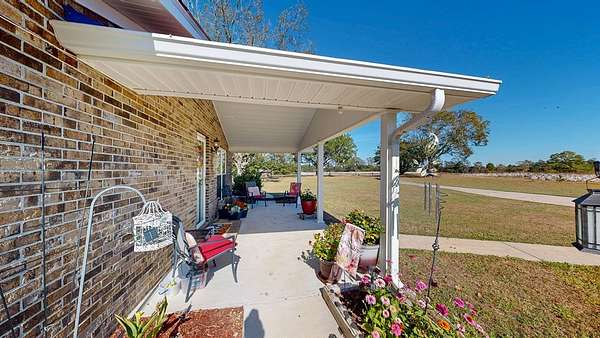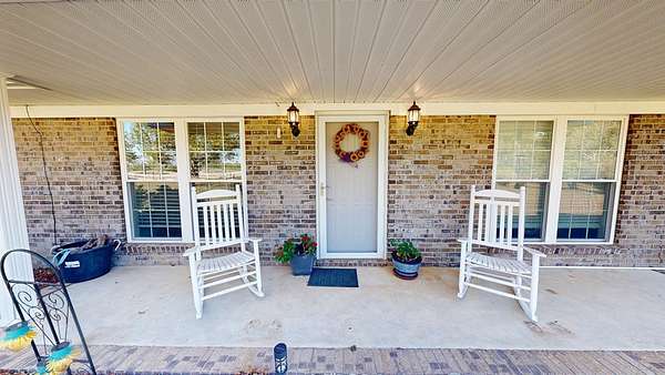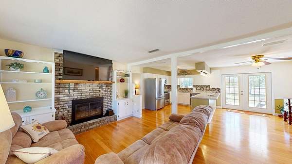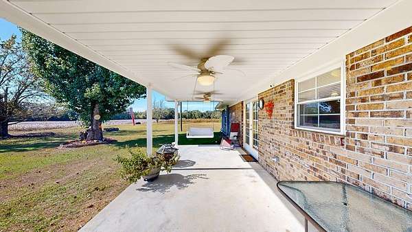 Enjoy peaceful country living in this beautifully maintained 3-bedroom, 2-bath home with 1,431 square feet of living space. The traditional layout features a long covered front porch and an open interior design with stunning wood floors throughout (no carpet!). The spacious living area centers around a large brick wood-burning fireplace, while the updated kitchen offers stainless steel appliances, an eat-at bar, and a cozy dining nook with French doors leading to a large covered patio complete with ceiling fans. A versatile bonus room off the living area can serve as a formal dining space, office, or second sitting room. There is a door that opens to another large covered patio. The generous laundry room provides extra storage with built-in cabinetry. The primary suite includes an en suite bath with walk-in shower, and the two guest bedrooms share a hall bath with a large vanity and ample storage. Outside, enjoy a 2-car detached garage with a sidewalk leading to the side patio for easy access to the bonus room. Best yet? There is a refreshing above-ground pool with a small wood deck for easy access. With beautiful farmland views to enjoy from your outdoor living spaces and peaceful surroundings, this property perfectly blends comfort and country charm.