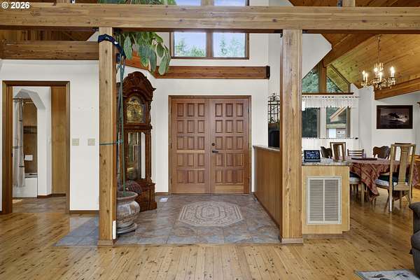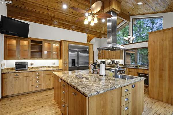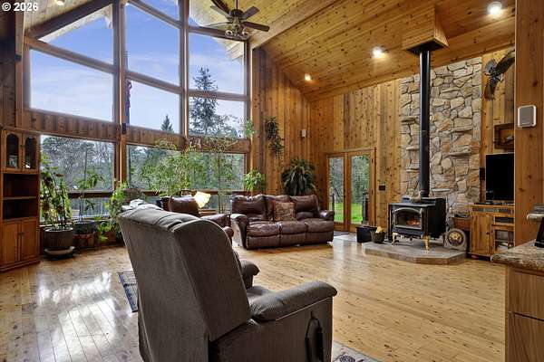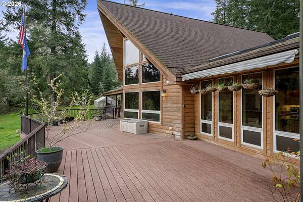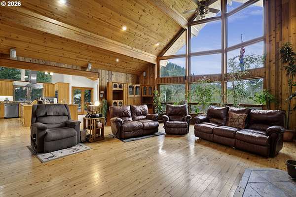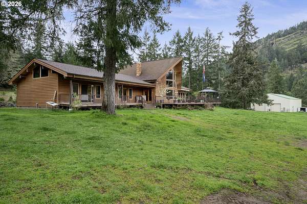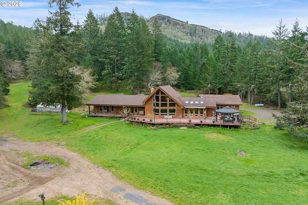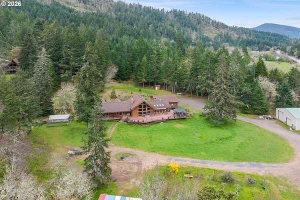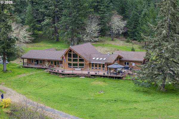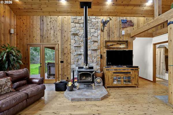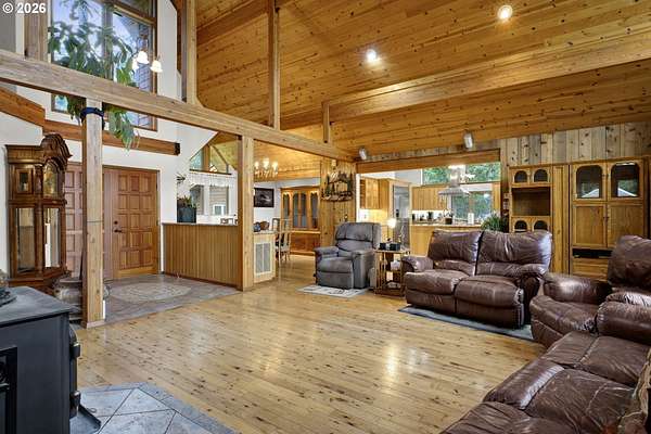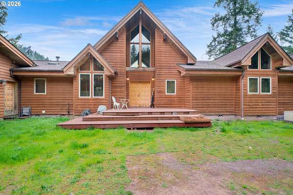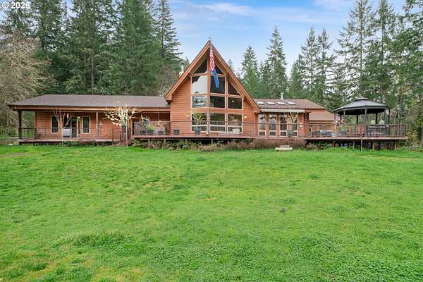 Exquisite Lindal Custom Cedar home on 5 flat acres featuring a 2,400 sq ft shop with full bath, dual doors, and room for a 40' motorhome, plus 3 RV hookups (2 across the driveway) with power, water, and RV dump by the shop. The gourmet kitchen is a chef's dream with granite counters, dual sinks, pot filler, gas range with warming drawer, double ovens, hidden butcher block, and abundant storage, including a bar/dining area with separate prep sink. The primary suite features a walk-in closet, walk-in glass shower, and sliding glass door to the deck. Enjoy 2 HVAC systems, washer/dryer that stay, spigots for greenhouse irrigation, 216 sq ft deck with retractable awning, powered chicken coop, and wood shed with wood. A rare blend of luxury, functionality, and lifestyle-a must-see!