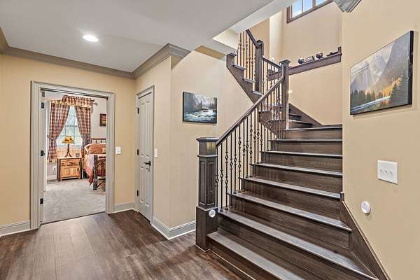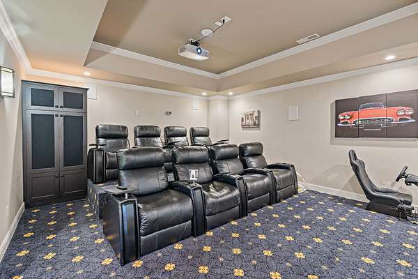 The main-level primary suite offers a spa-like retreat, featuring a soaking tub, steam shower, heated floors, and dual oversized walk-in closets. An open staircase leads to the lower level, where you'll find two additional bedroom suites, a spacious bonus/rec room, and a private movie theater for the ultimate entertainment experience.