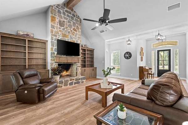 Outdoor living is equally impressive, with a wide covered patio featuring a ceiling fan and a second wood-burning fireplace—the ideal setting for entertaining summer guests or enjoying crisp fall evenings by the lake.