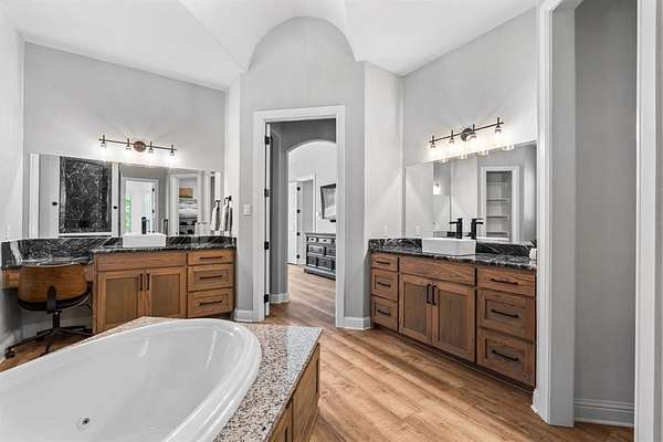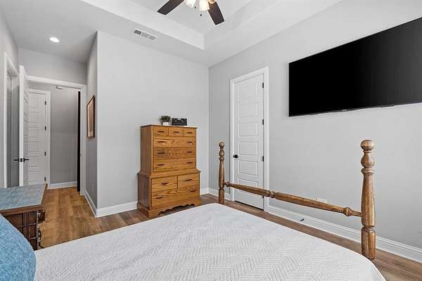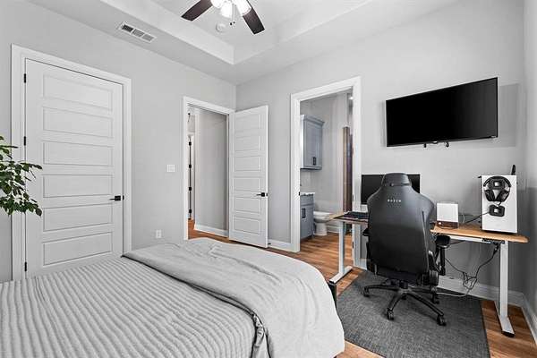 The thoughtful split-bedroom layout ensures comfort and privacy. The primary suite serves as a true retreat with a spa-like bath boasting an oversized walk-in shower with multiple shower heads and dual expansive walk-in closets. On the opposite side of the home, three additional bedrooms each with their own bathroom!