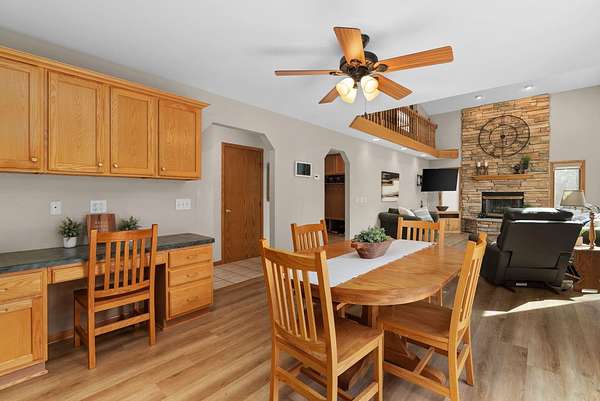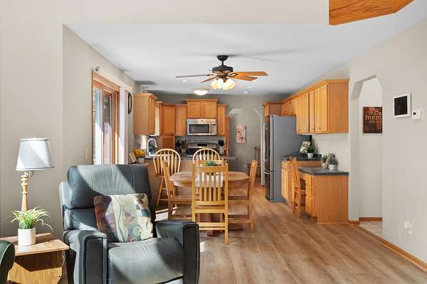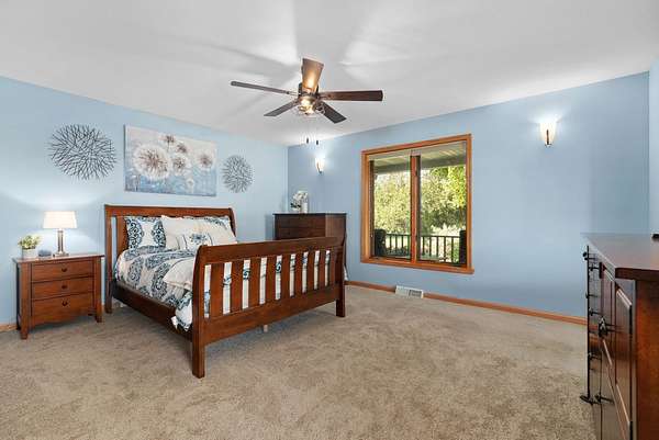 Nestled on 2.56 wooded acres, this custom-built retreat delivers the country lifestyle you've been craving. A wrap-around porch sets the tone — perfect for morning coffee and wildlife watching. Inside, a soaring 2-story great room with floor-to-ceiling stone fireplace anchors the main floor, joined by a bedroom/office, formal dining room, and laundry. The primary suite impresses with cathedral ceilings, skylights, jetted tub, dual vanities, and walk-in closet. The finished lower level channels a true Northwoods lodge feel with a gas fireplace, wet bar, and room for movie or game nights. Outside, enjoy an expansive deck, paver patio, and tranquil pond. New LVP flooring and carpet. Low Bristol taxes, quick Hwy 151 access — peaceful setting, close to everything. Don't miss this opportunity!