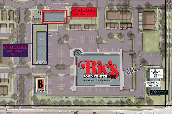 North on Northland Dr East on Belding Rd Town Square Community on North side of the road