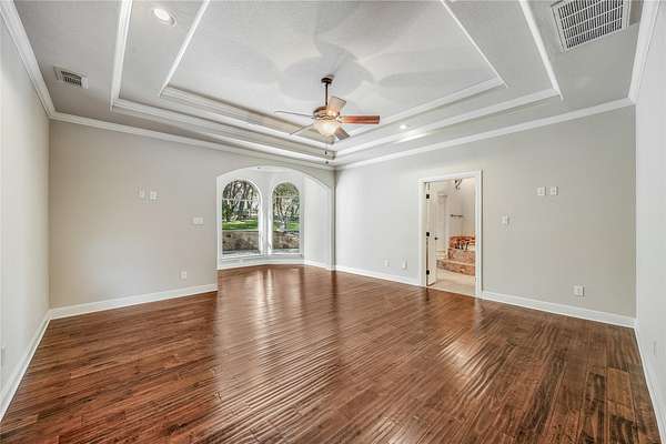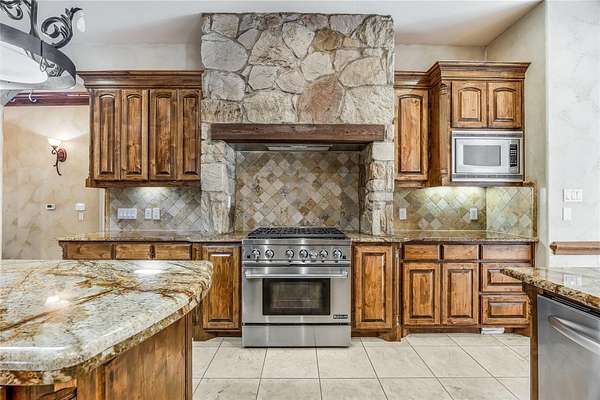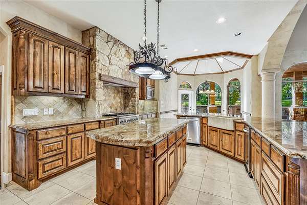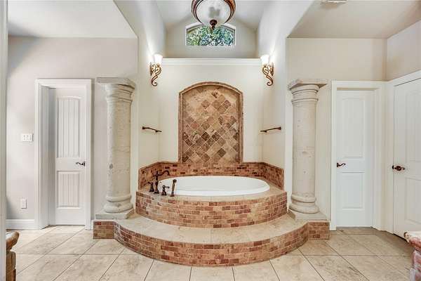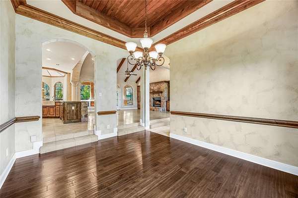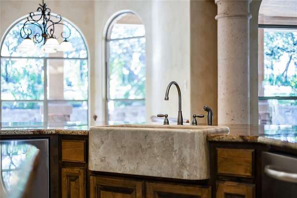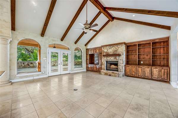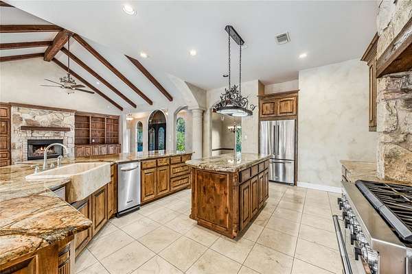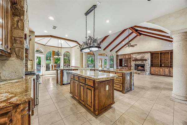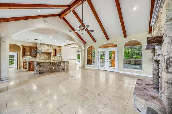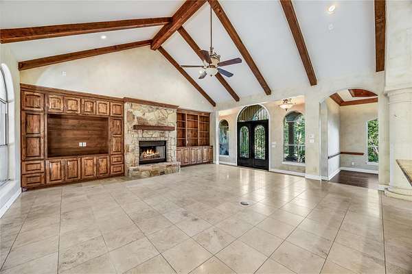 - Beamed Ceilings, Built-In Features, Ceiling-High, Crown Molding, Open Floorplan, Primary Bedroom On Main, Stone Counters