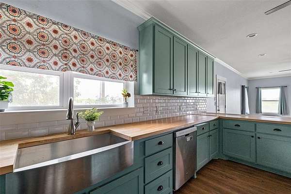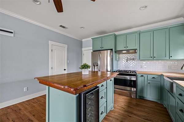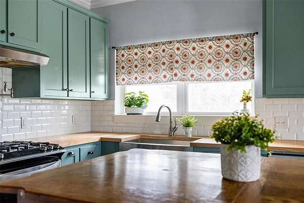 Inside, you’ll find 2 spacious bedrooms and 2 full bathrooms, both featuring large walk-in showers designed for comfort and style. The farmhouse-inspired kitchen is truly the heart of the home, complete with a gas range, beautiful butcher block countertops, a large center island ideal for gathering and meal prep, and a large walk-in pantry that provides abundant storage for all your cooking essentials. Kitchen island as family kitchen table that brings charm to farm house kitchen.