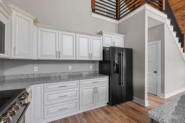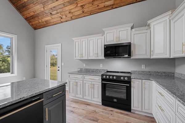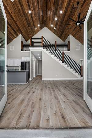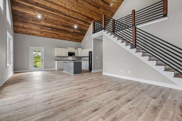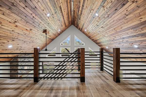 This charming 3 Bedroom, 2.5 Bath lakeview home blends rustic elegance with modern comfort in a serene, wooded setting. The exterior features a beautiful combination of green Metal siding, rich natural wood accents, and a sleek black metal roof. Its inviting covered front porch, supported by timber posts, offers the perfect spot to relax and take in the peaceful views.