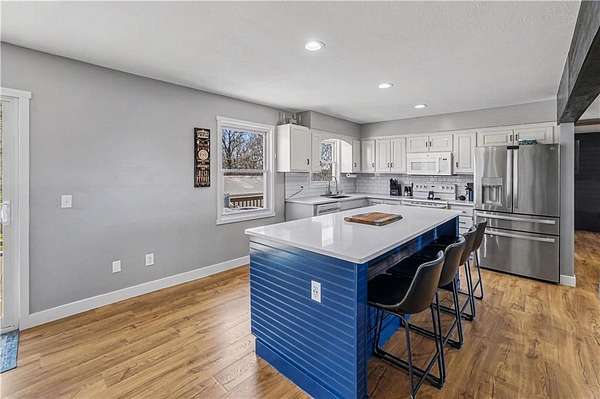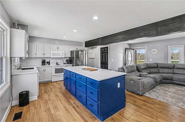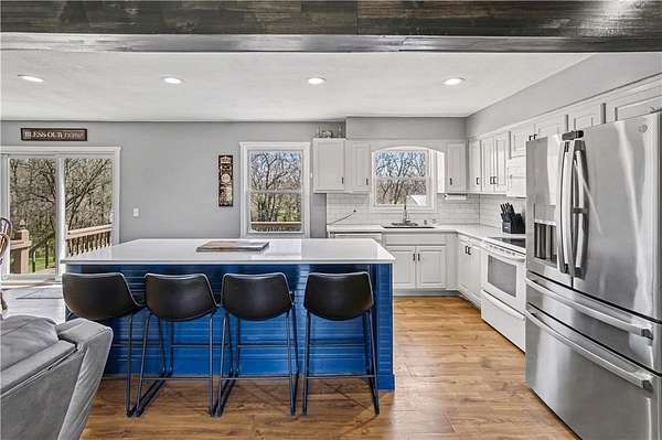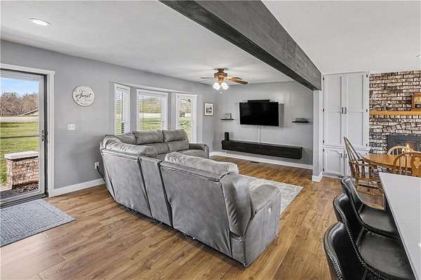 Discover the perfect blend of modern updates, functional space, and peaceful country living with this beautifully maintained home on 3 acres in sought-after Clinton County-located within the highly desirable Kearney School District. The completely remodeled main level offers a bright, open-concept layout where walls have been removed to create a spacious and inviting flow between the living, kitchen, and dining areas. The stunning kitchen is a true centerpiece, featuring new cabinetry, updated countertops, a stylish backsplash, and an oversized island that's perfect for gatherings and entertaining. New flooring runs throughout the main level, while custom built-ins in the dining area add both charm and convenience, with easy access to the large deck overlooking the property. The primary bathroom has been tastefully refreshed with a new vanity, enhancing the home's modern appeal. Downstairs, the finished lower level provides additional living space, including a bedroom and a 3/4 bath, both updated with new flooring. The laundry has also been thoughtfully relocated for added convenience. Outside, enjoy the beauty and privacy of a treed backyard on your expansive acreage. The property includes a storage shed and a large outbuilding/shop complete with concrete flooring and electricity-ideal for hobbies, equipment, or extra storage. A chip-and-seal driveway adds to the home's curb appeal and functionality. Well-maintained and truly move-in ready, this property offers space, updates, and versatility-inside and out.