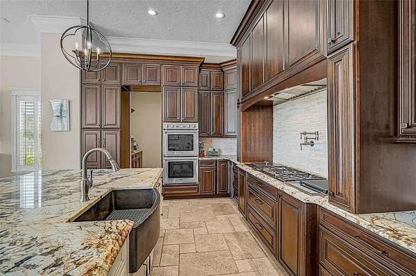 - Built-In Features, Ceiling Fans(s), Crown Molding, High Ceilings, Kitchen/Family Room Combo, Living Room/Dining Room Combo, Open Floorplan, Primary Bedroom Main Floor, Solid Surface Counters, Solid Wood Cabinets, Split Bedroom, Stone Counters, Thermostat, Walk-In Closet(s), Wet Bar, Window Treatments