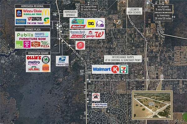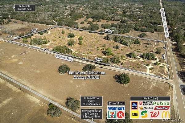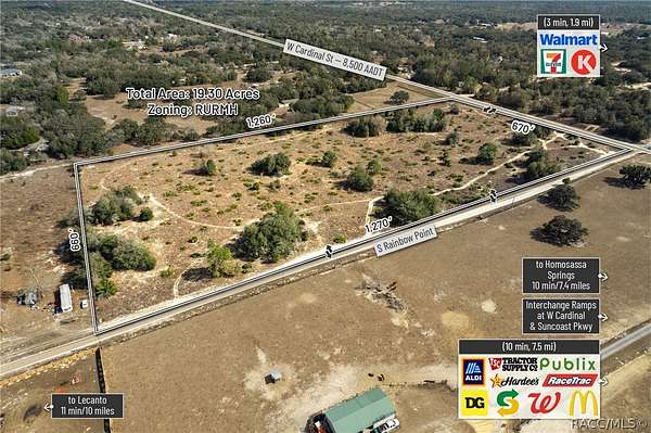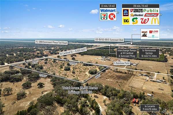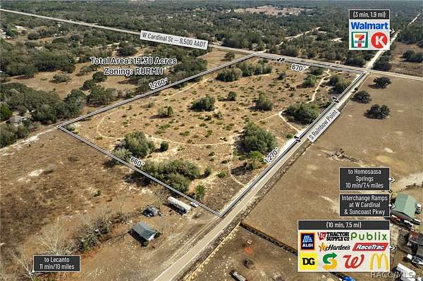 This 19.3+/- acre development tract is strategically positioned within the Cardinal Mixed-Use Interchange Management Area (IMA), just east of the recently expanded $135 million Suncoast Parkway (SR 589) interchange in Citrus County, Florida. Situated along one of the primary northward growth corridors extending from the Tampa-St. Petersburg MSA, the property benefits from interchange-level access and sustained public infrastructure investment that continues to fuel residential and commercial expansion throughout the region. The site falls within the designated Mixed-Use Development area, allowing residential densities ranging from 6 to 20 dwelling units per acre subject to Master Planned Development (MPD) approval. Based on approximately 18+/- acres within the mixed-use designation, the property presents a theoretical development yield ranging from approximately 119 units at 6 dwelling units per acre to as many as 386 units at 20 dwelling units per acre. This density flexibility supports a variety of development concepts including multifamily, build-to-rent communities, townhomes, or integrated mixed-use residential projects, providing scale and adaptability in a supply-constrained corridor. Infrastructure accessibility materially enhances the feasibility profile of the site. A jurisdictional pressure sewer system is located within approximately 2,000 feet of the property boundary, and a 12-inch water main is available for direct connection, providing the necessary capacity to support MPD-level development intensity. The combination of density allowances, utility proximity, and interchange positioning establishes this parcel as one of the more compelling large-scale residential opportunities within the expanding Suncoast Parkway corridor. Citrus County remains one of Florida's strongest emerging growth markets, with a current population of approximately 153,600 residents projected to exceed 350,000 by 2030 according to County planning estimates. The region continues its transition into a major residential, healthcare, and service hub within the Tampa Bay sphere of influence. The completed parkway expansion and planned northern Phase 3 extension-located just north of the subject property-will provide direct one-hour connectivity to Tampa International Airport and surrounding employment centers, significantly increasing regional mobility, tourism flow, and housing demand. Within a 15-minute trade area, the site serves approximately 46,361 residents with stable demographics, including an average age of 58 and a median household income of approximately $65,000. The convergence of sustained population growth, expanding infrastructure, and interchange-controlled density positions this property as a high-visibility, scalable, and future-proof development opportunity in one of Florida's advancing growth corridors.