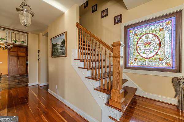 This stunning 3-bedroom, 2.5-bath home sits on over 5 acres and is full of character and charm. Inside, you'll find stained glass accents, wide plank cherry hardwood floors, crown molding, custom tile, and beautiful custom fixtures throughout. The main level features a spacious, open kitchen with custom cabinets, countertops, and a large island, overlooking the living area and cozy fireplace. Large bay windows create the perfect space for a dining area or additional sitting room. The main level also features a half bath and a large mudroom with laundry access. Upstairs offers three bedrooms and two full bathrooms, both featuring heated floors, custom tile, and walk-in showers. The primary suite is filled with natural light from oversized bay windows and includes a large walk-in closet. Downstairs, the full unfinished basement provides endless possibilities for future living space, storage, or a workshop. Outside, enjoy peaceful views of pasture, mountains, and a nearby lake, along with two outbuildings ideal for storage or hobbies. Don't miss the opportunity to own this truly custom home on beautiful acreage!