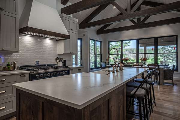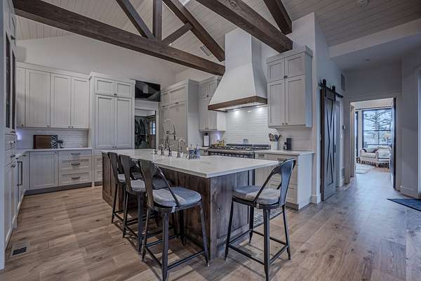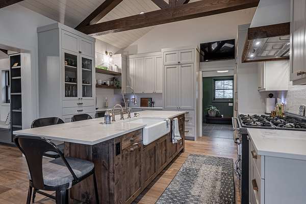 Handcrafted beams, Earthwood cabinetry, quartz countertops
