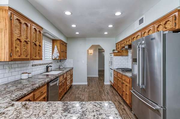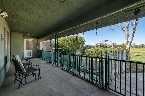 This classic ranch-style home with solar is set on approximately 1.91 acres and offers 2,463 sq. ft. with 3 bedrooms and 2 bathrooms, blending comfortable living with country charm. The kitchen features granite countertops, subway tile backsplash, a gas cooktop, double ovens, pantry, and an adjacent dining area. A formal living and dining room provides flexible space for a home office, library, or additional gathering area. The spacious family room includes a wood-burning fireplace insert and sliding door to the backyard, offering flexibility for a fourth bedroom, office, or bonus room. Ceramic tile flooring, ceiling fans, and plantation shutters are featured throughout the home. The backyard offers a covered patio, open grassy area with mature landscaping, front and backyard sprinkler systems, and 30+ Satsuma Mandarin trees, creating a peaceful outdoor setting with room to relax or entertain. The property also features gated RV access, ample RV parking, and full RV hookup with power and a dedicated septic connection, providing additional functionality for recreational vehicles or equipment. A rare opportunity to own a charming country ranch on acreage within the Clovis Unified School District, offering space, privacy, and flexibility while remaining conveniently located to nearby amenities.
