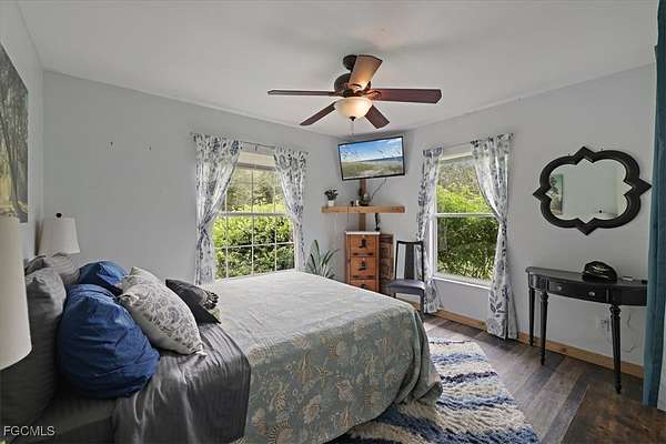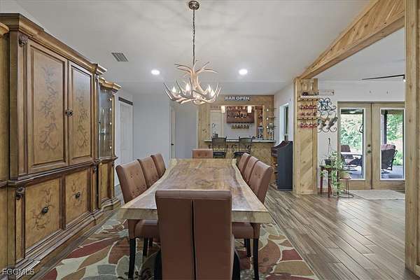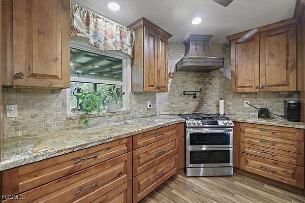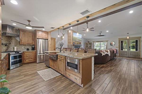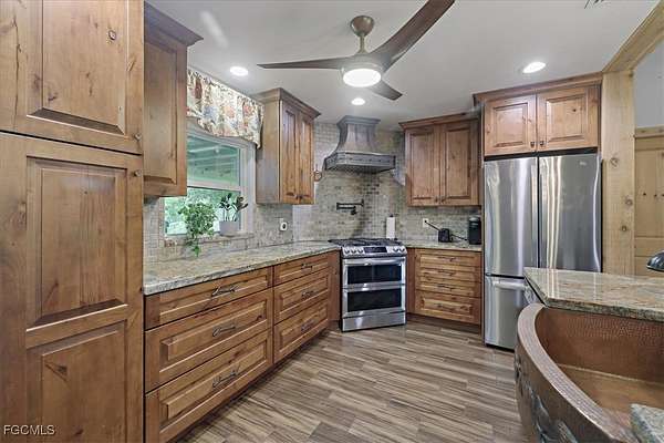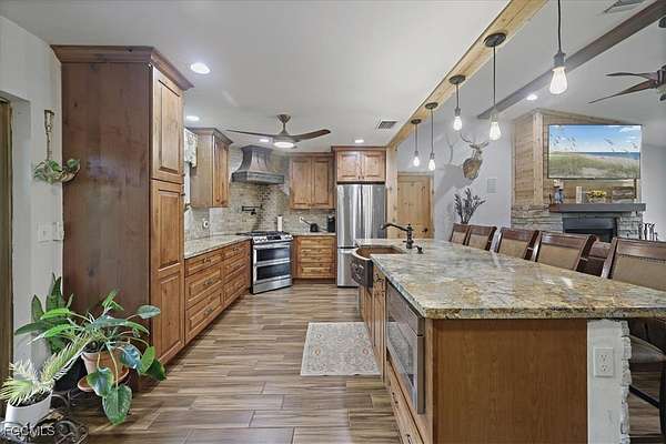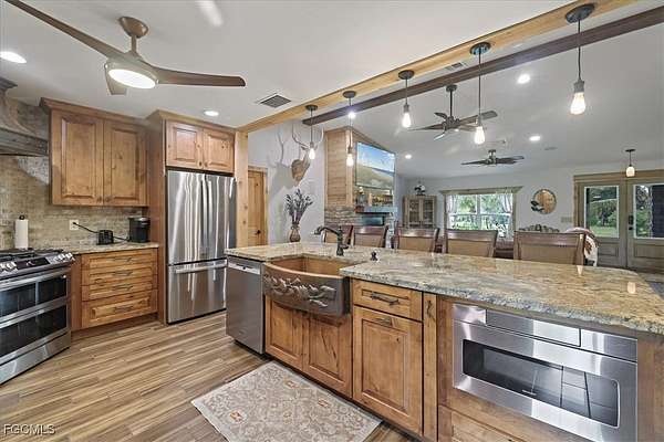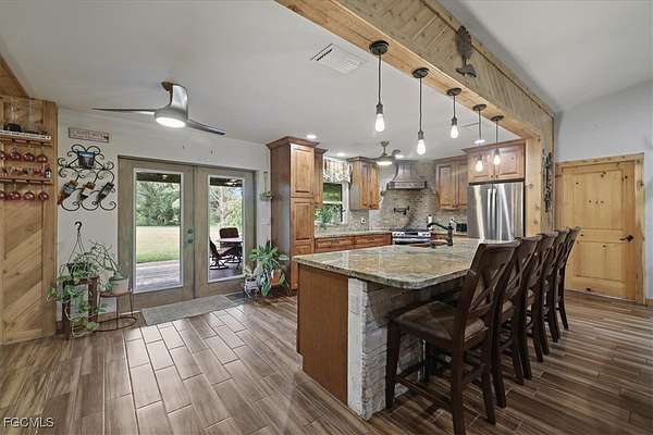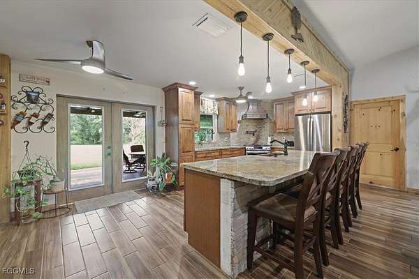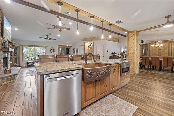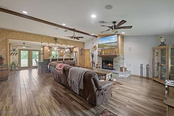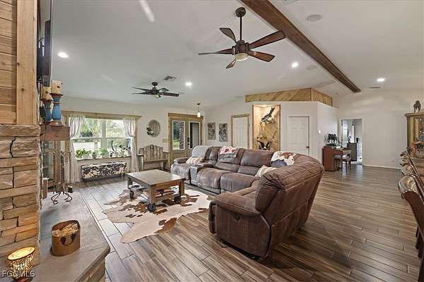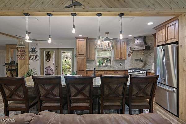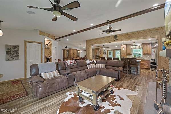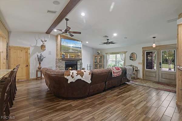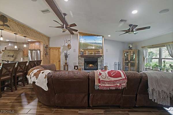 Discover this beautifully renovated and expanded 4-bedroom, 2-bath home situated on 3.12 acres of peaceful land, inspired by the charm of a Tennessee cabin and offering a perfect blend of rustic character and modern luxury. A 2017 permitted renovation added 350 sq. ft. and over $175,000 in thoughtful upgrades, including a long-lasting metal roof, hurricane-impact windows and doors throughout most of the home, and a full redesign of the kitchen and primary suite. The chef's kitchen features knotty pine cabinetry, a handcrafted copper range hood, matching copper farmhouse sink, pot filler, built-in spice drawers, soft-close cabinets, oversized pull-out drawers, and high-end bronze fixtures, all designed for beauty and functionality. The open living area centers around a stunning floor-to-ceiling stone and cedar wood-burning fireplace, with wood-look tile flooring throughout the main spaces for added warmth and durability. The spacious primary suite includes a dedicated A/C system, vaulted ceilings, a luxurious bath with a two-person jetted tub, an oversized shower with rain head, body jets, seating, and handheld wand, plus a dual-sink vanity, soft-close cabinetry, and a custom cedar walk-in closet. Built-in speakers in both the bedroom and bathroom enhance the retreat-like ambiance. Recent system upgrades include a 2023 HVAC with all-new ductwork, 2022 water heater, 2024 refrigerator and washer/dryer, 2025 dishwasher, and a 2021 under-counter microwave. Entertainment is effortless with living room surround sound extended to the back porch, and a built-in cedar bar offering custom shelving and cabinetry. Outdoors, enjoy a 50'x36' concrete workshop with electric, water, and air valves, a 12'x20' concrete pad with power, and a 24'x24' lean-to ideal for equipment or recreational storage. A 2023 permitted underground propane tank fuels the double gas stove and is ready for generator hookup. The property is fully fenced and includes an automatic solar-powered entry gate with remote access, more than 1,000 linear feet of professionally packed gravel driveway with proper drainage, extra parking, and multiple storage areas. The land is beautifully maintained with mature oak trees, fruit trees, and lush landscaping, all supported by a 4-zone timed irrigation system. There's ample room to add a pool if desired. Located on a quiet paved road surrounded by other well-kept homes, this home offers both privacy and convenience, just minutes from shopping and the interstate. Zoned AG2 with no HOA, the land has never flooded and was elevated with hundreds of loads of fill, making this a rare opportunity for peaceful country living with modern convenience and lasting quality.