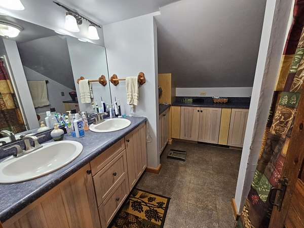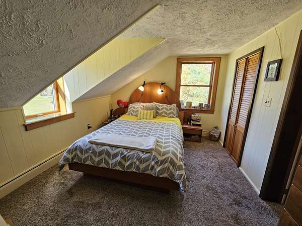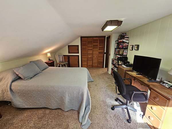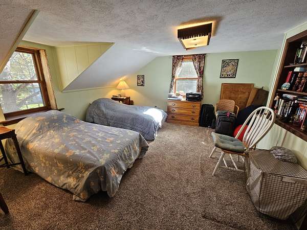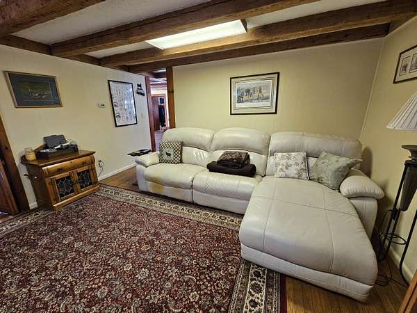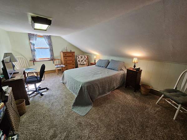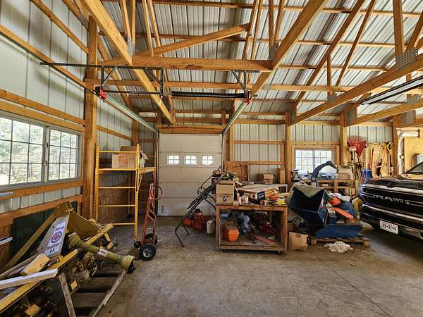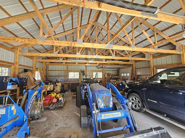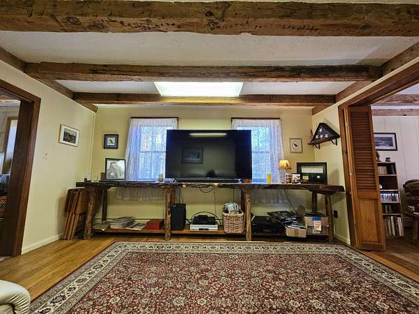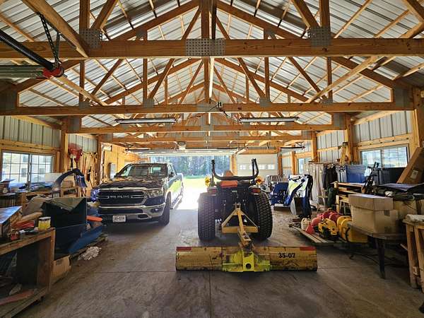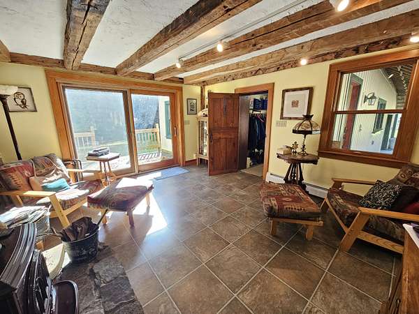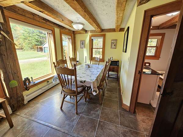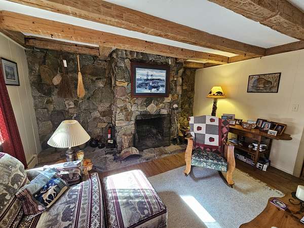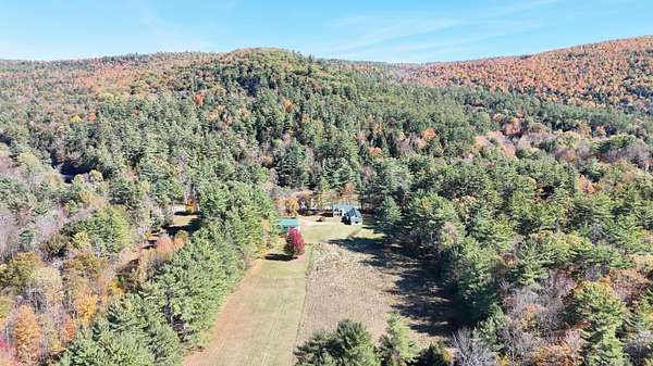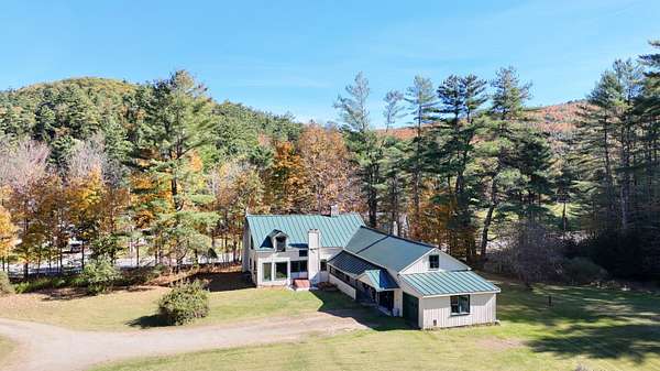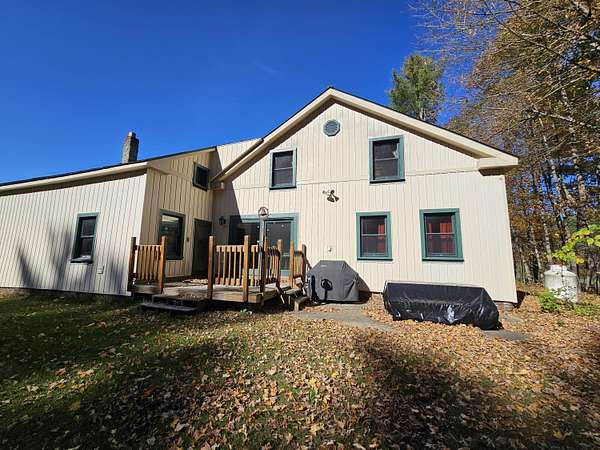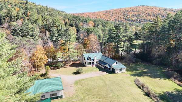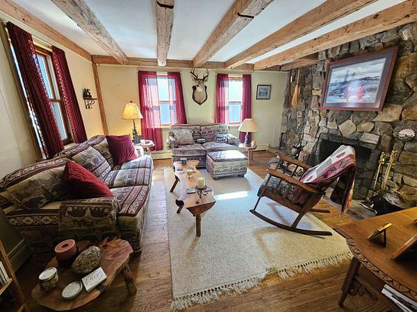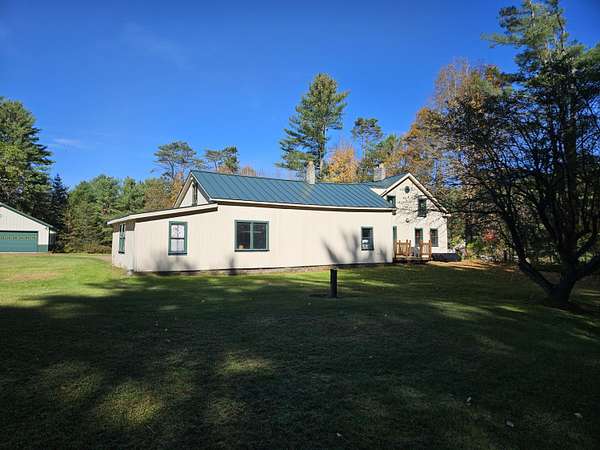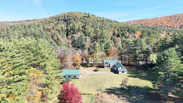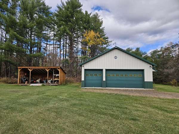 This spacious, two-story home, originally built in 1806, offers spectacular views of Bald Peak and Green Mountain on this 23.14-acre property in the Adirondacks. The interior features 4 bedrooms, 2 full bathrooms, and an office with a wood stove. The ground floor's welcoming living room features a wood stove nestled against a stone wall, creating a cozy atmosphere. The home also includes a spacious den with a stone fireplace. Exposed wooden beams throughout add character and warmth to the living spaces. The well-equipped kitchen boasts modern appliances, Adirondack green granite countertops, red birch cabinetry, and a central island, ideal for meal preparation. A bright dining area with large windows offers picturesque views of the surrounding mountains and local wildlife. Throughout the house, you will find thoughtful details such as built-in bookshelves, hardwood floors, and carpeted areas for comfort. The bathrooms blend functionality with style, including one with a classic clawfoot tub. Attached is a utility room / workshop and two car garage. In addition there is a large, modern, four car detached garage with a lean-to shed for ample storage and parking. Enjoy the beauty of the Adirondacks right from your backyard when golfing on the driving range or walking in the field. This property offers a harmonious blend of traditional charm and modern living, making it an ideal family home or retreat.