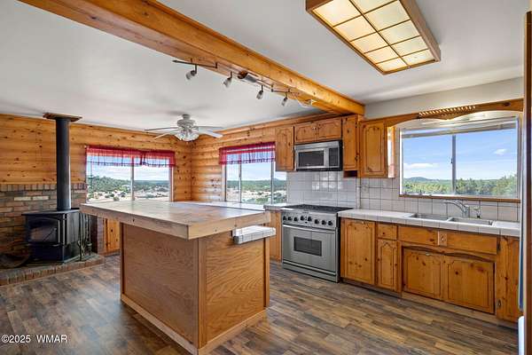 Experience breathtaking panoramic views from this stunning hilltop home, perfectly situated on 6 private acres! Enjoy the ultimate in versatility with a massive 6-car shop featuring a hoist, plus an additional shed for all your storage needs. The circular driveway offers easy access and plenty of parking for guests. Inside, the spacious chef's kitchen is perfect for enrtertaining-complete with an oversized KitchenAid gas range, matching fridge, a large island, and ample room for all your guests. Relax in the open-concept living area, or step out onto the expansive deck to watch wildlife and savor spectacular sunsets with your favorite beverage. The home features two master suites on the main level. Some recent remodeling leaving the remaining updates ready for your personal touch!