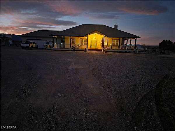 Time to Star gaze, set on 2.44 acres overlooking 360 views of gorgeous valley zoned for horses. Wrap around deck provides views in every direction. VA assumable loan @ 3.25! Quality craftsmanship and upgrades thru-out with va, zoned ulted ceilings, hardwood floors, plantation shutters on every window. Open concept, living room, dining and kitchen. Kitchen has custom cabinets, pantry, granite countertops, island sink and S/S appliances. Primary & 2nd bedrooms have adjoining baths & existing den can be converted to a 3rd bedroom. Primary bath has walk-in shower, Jacuzzi jetted tub, 2 vanities and walk-in closet. Large laundry room has wash tub and additional refrigerator. Mud room off laundry room. RV hook up includes exterior bathroom with toilet, sink and shower and waste and fresh water hook up. New 16 x 32 above ground pool. Low maintenance fully fenced yard. A Sporting delight with fishing, hunting, State Parks and the historic mining town of Pioche nearby. Home is here!