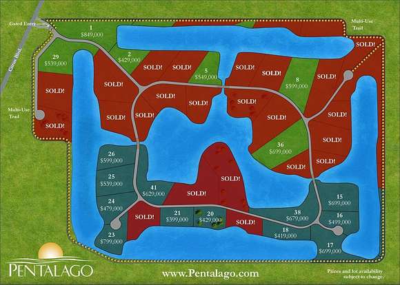Est $3,061/moWelcome to this stunning waterfront property located at 6750 SW Pentalago Cir in Palm City, FL. This lot consists of roughly 1.9 acres upland and 3.1 acres submerged. Main portion of lot is approx. 300 feet wide by 190 feet deep. Pentalago is a gated residential lake community designed for tournament water skiing, and includes 5 interconnected lakes and 42 lakefront lots. Bring your own Custom Builder and build the home of your dreams. Upland varies by lot, average upland is 3 /-acres with 2 /- acres of water. (5 Acres total).