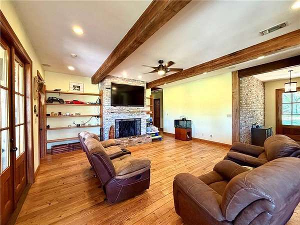 Welcome to your private country retreat, where timeless character meets peaceful acreage. Nestled on 4.33 beautiful acres, this classic home offers the perfect blend of historic charm and modern comfort. Inside, you’ll find 3+ spacious bedrooms and 2 full bathrooms, along with stunning 150-year-old heart pine flooring that flows throughout the home, showcasing craftsmanship you simply can’t replicate today. The living area features massive 10x10 heart pine beams and one of two cozy wood-burning fireplaces — ideal for gathering with family and friends. The kitchen is both functional and inviting, equipped with stainless steel appliances and a gas cooktop for those who love to cook and entertain. With its timeless architecture, warm natural materials, and serene country setting, this home offers a rare opportunity to enjoy privacy, space, and authentic Southern character — all while being just a short drive from everyday conveniences. Come experience the beauty, history, and tranquility this one-of-a-kind property has to offer.