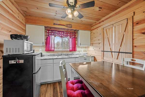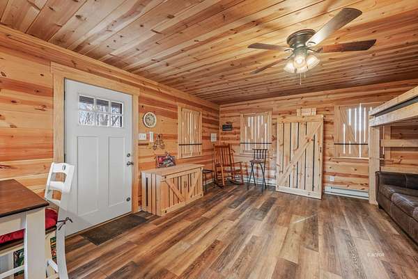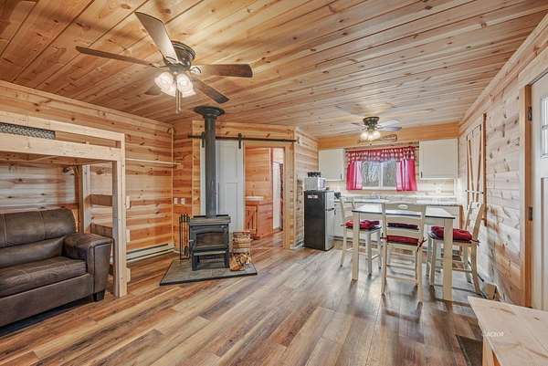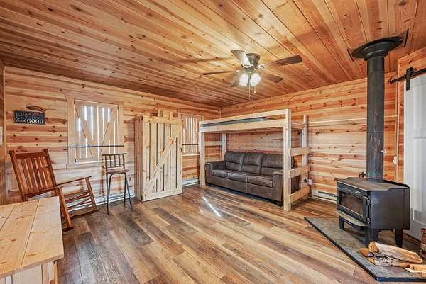 Secluded hunting and recreational cabin situated on 6 wooded acres in a quiet, rural setting. This hunting cabin offers a covered front porch overlooking the surrounding timber, providing a peaceful retreat ideal for weekend getaways or seasonal use. The interior features warm wood finishes throughout, an open living area with a wood-burning stove, kitchen with dining space, and a full bathroom. Sleeping accommodations include bunk space, making it well-suited for hunters or outdoor enthusiasts. Electric service is in place, and the property offers privacy with abundant wildlife, mature trees, and scenic views in every direction. Whether you're looking for a private hunting camp, recreational base, or an off-grid escape, this property delivers simplicity, functionality, and seclusion - all within a manageable acreage footprint. Electric on demand hot water heater and new septic system