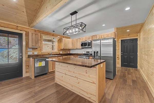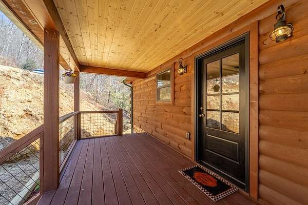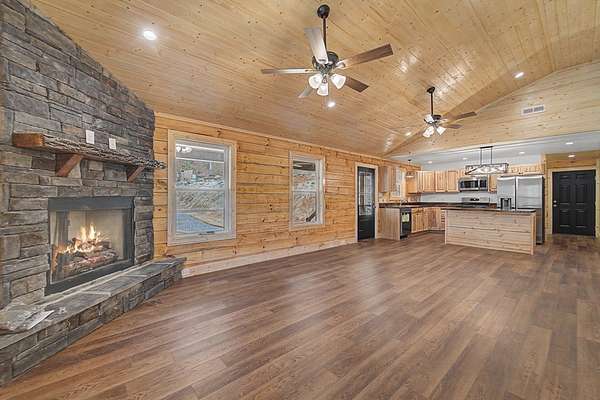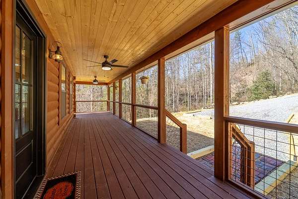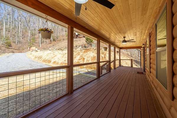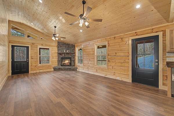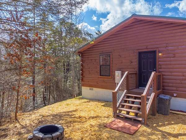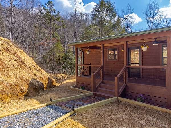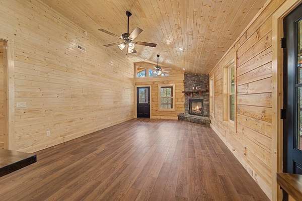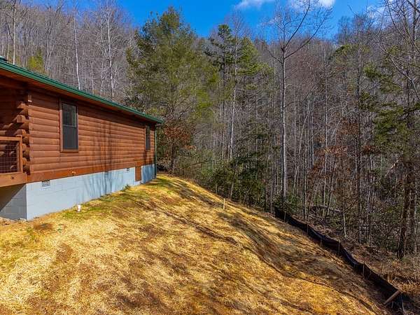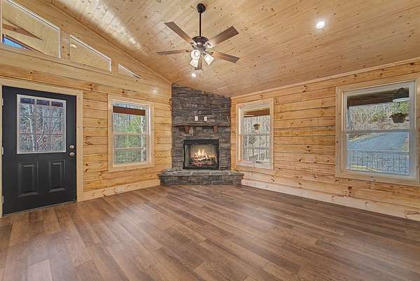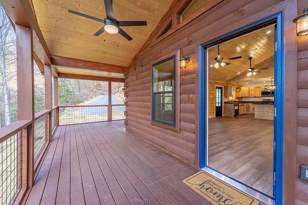Welcome to this charming brand-new 2-bedroom, 2-bath log cabin that blends rustic warmth with modern comfort. The open living and kitchen area features vaulted tongue-and-groove ceilings, butcher-block countertops, stainless steel appliances, generous cabinet and counter space, and an island with a breakfast bar that connects easily to the dining area. A cozy corner stacked-stone gas fireplace anchors the living room, creating the perfect spot for cool mountain nights. The spacious primary suite offers a vaulted ceiling, dual-granite vanity bath, and private access to the wraparound covered porch. A guest bedroom, second bath, and a large laundry/storage room with a gas tankless water heater complete the interior, all enhanced by durable luxury vinyl plank flooring. Outside, enjoy a low-maintenance exterior with a metal roof, seasonal winter mountain views with summer privacy, ample parking, and a dedicated firepit area. Located in a gated log cabin community with sensible restrictions and paved roads, this home offers peace of mind and convenience. Just minutes from Harrah's Cherokee Casino, it's ideal as a vacation rental, second home, or full-time getaway.