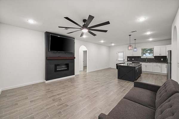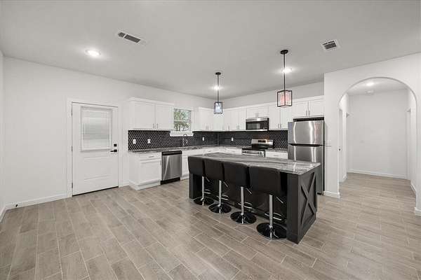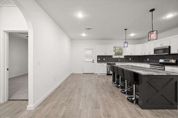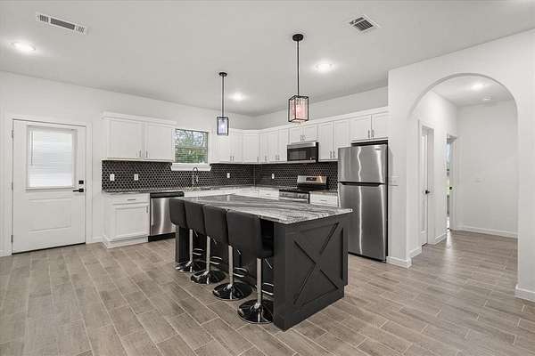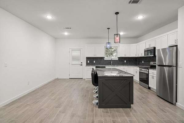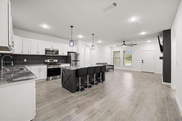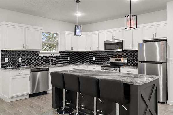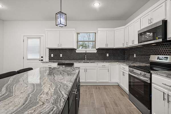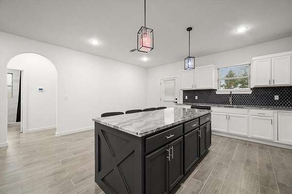 - Decorative Lighting, Double Vanity, Eat-In Kitchen, Granite Counters, Kitchen Island, Open Floorplan