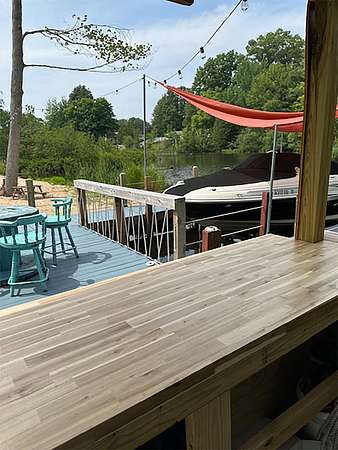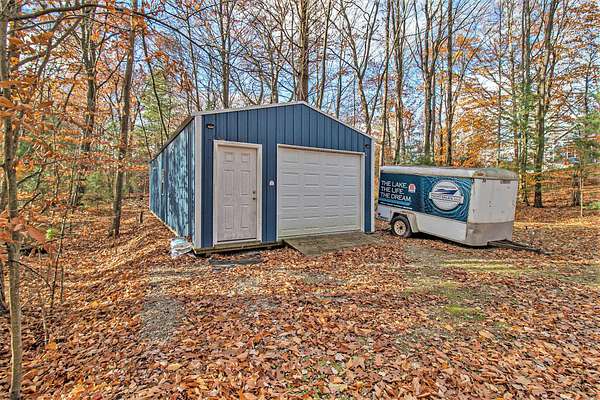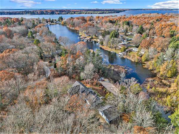2019 custom built home on 5.11 acres with 487 ft of Hamlin Lake frontage. Waterfront living with 22 ft boat slip and hoist and two tiki bars! This 5 bed 4 bath home has all the bells and whistles including 5th bedroom converted to a professional gym. Wet bar with dishwasher, sink and refrigerator, 3rd living room and golf simulator in lower walkout level. 2 car attached garage plus 30 x 24 detached garage with forced heat and workshop PLUS custom built sauna. There is also another 16 x 40 outbuilding with 2 man doors and solar lighting. 2 expansive back decks. Whole house generator. Main level primary with walk-in tile shower and jaccuzi tub. Huge main floor library can be 6th bedroom. Upper level with 2 spacious beds and full bath plus living room. Kitchen has island seating for 6, pantry and stainless steel appliances. Plenty of room for another outbuilding if desired. Horseshoe drive for easy access and tons of parking. Buyer to verify all information. Call today!