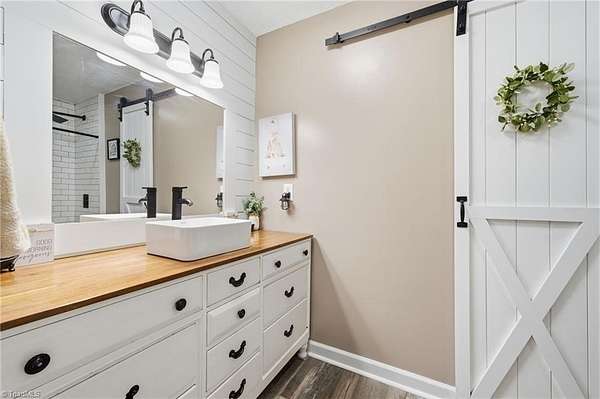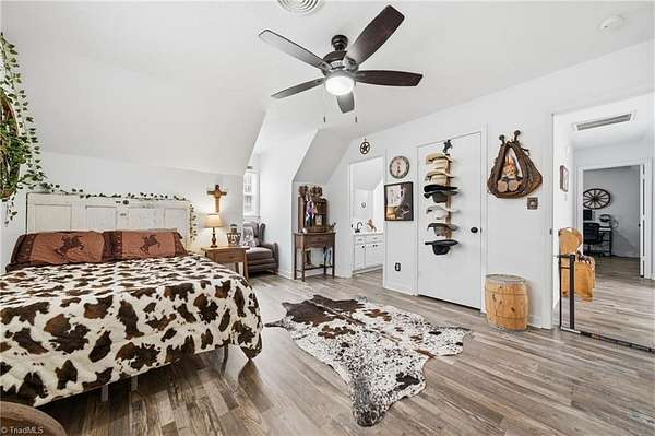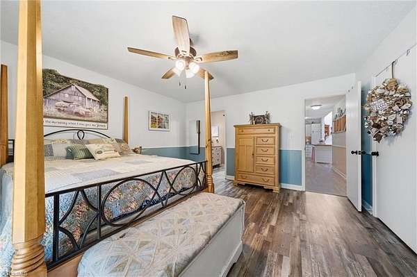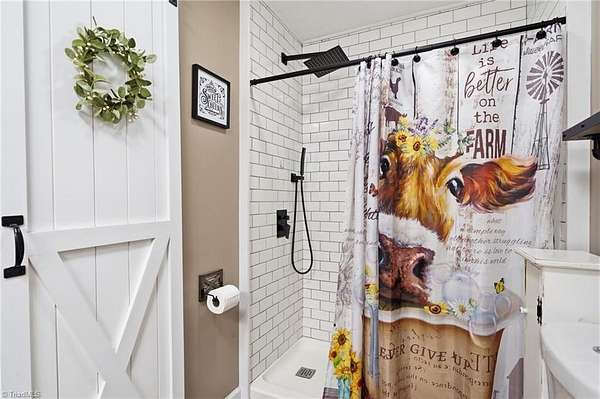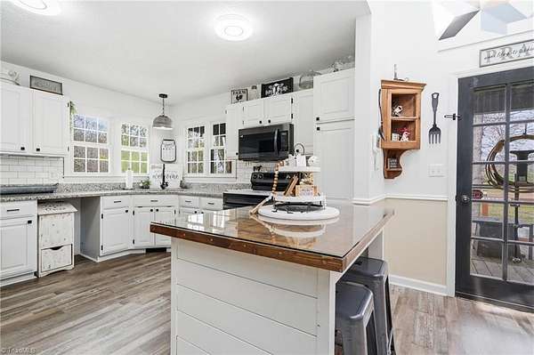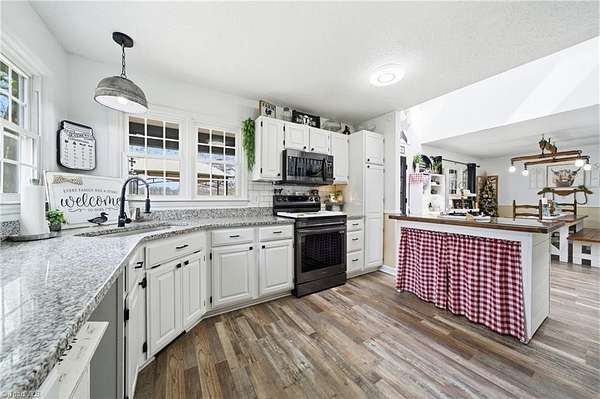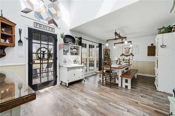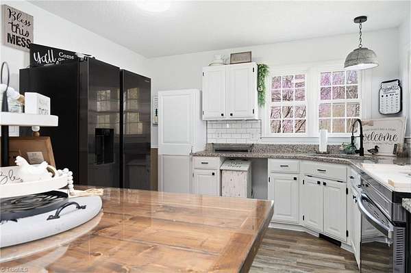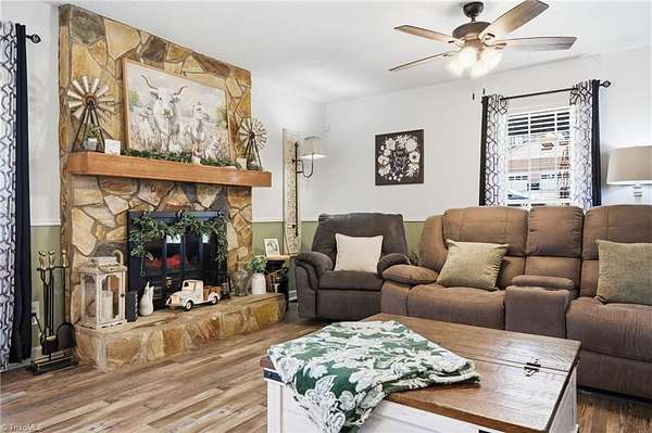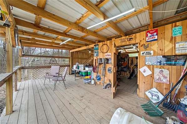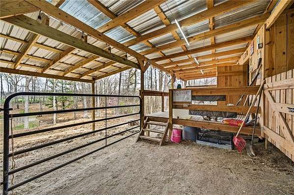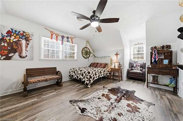 Experience the charm of country living on this beautifully maintained nearly 6 acre farm, privately situated at the end of a quiet road. The 3-bedroom home is completely updated with LVP flooring, fresh paint, farmhouse style kitchen w/ granite and SS appliances opening to a large dining area. Cozy nights can be spent by the stone fireplace. The primary bedroom is on the main level and there's additional space for a home office. The wrap around front porch has a rocking chair vibe or enjoy the back deck and porch that overlooks a private, stocked pond w/ fountain. The farm is thoughtfully designed with a 7 stall barn including hay storage and tack and feed areas, with water and power. The riding arena is surrounded by fenced pastures and there's even room for your donkeys, goats, chickens or whatever your heart desires. Enjoy privacy, tranquility and space to spread out on this story book mini farm. Convenient to Greensboro & High Point and a short drive to the Carolina Horse Park.