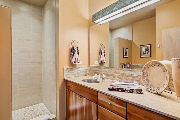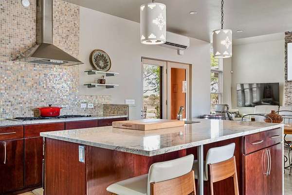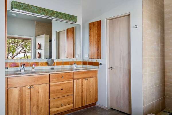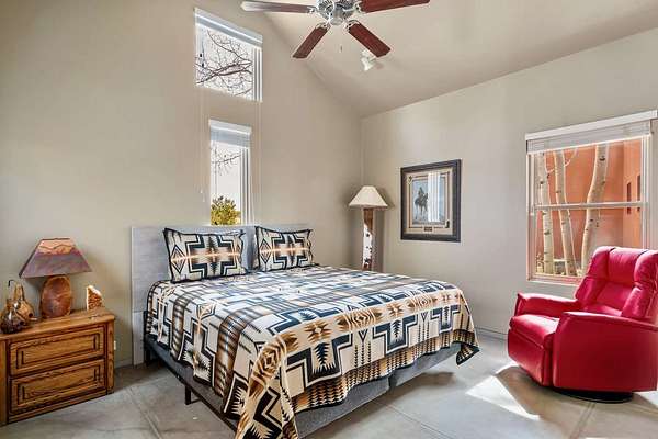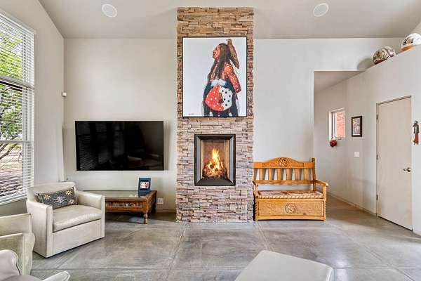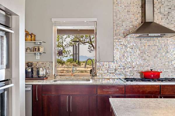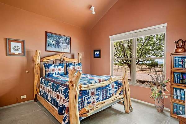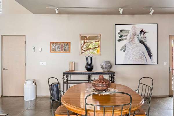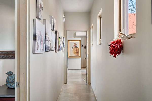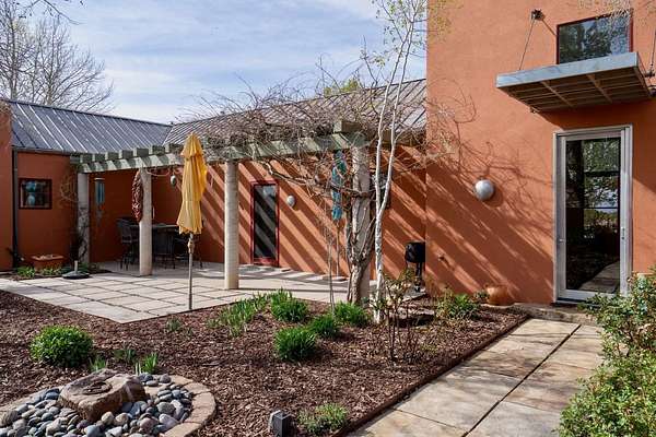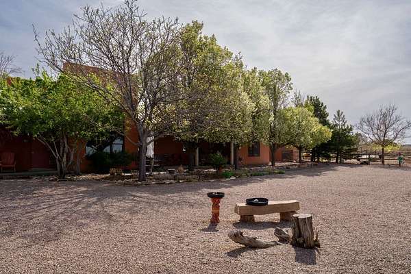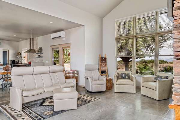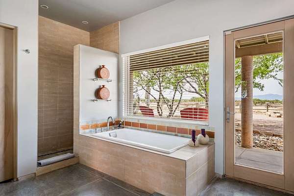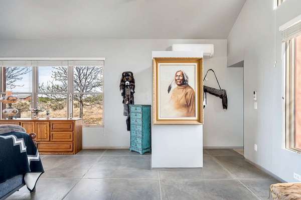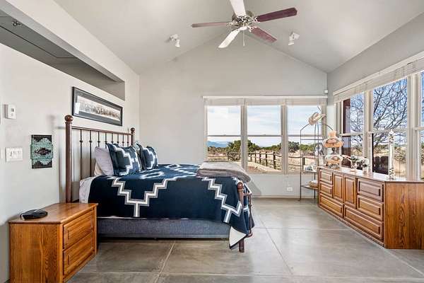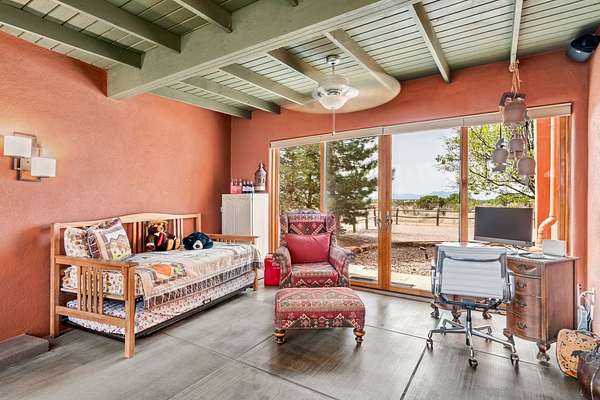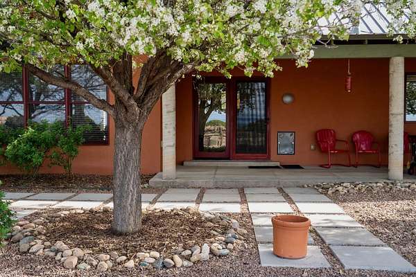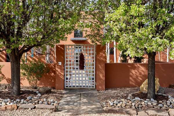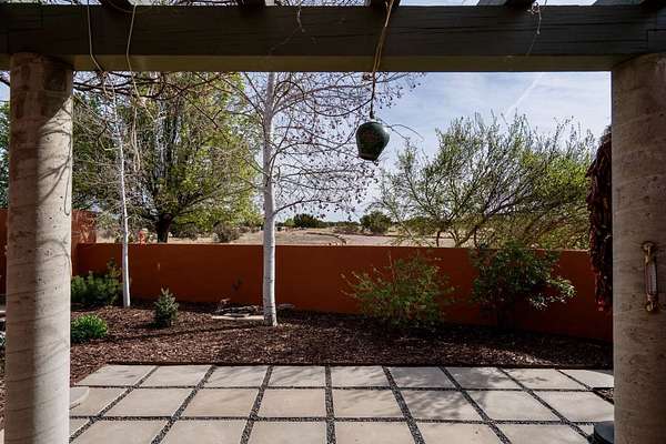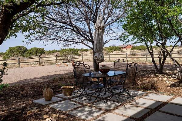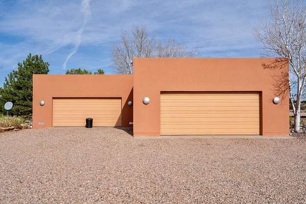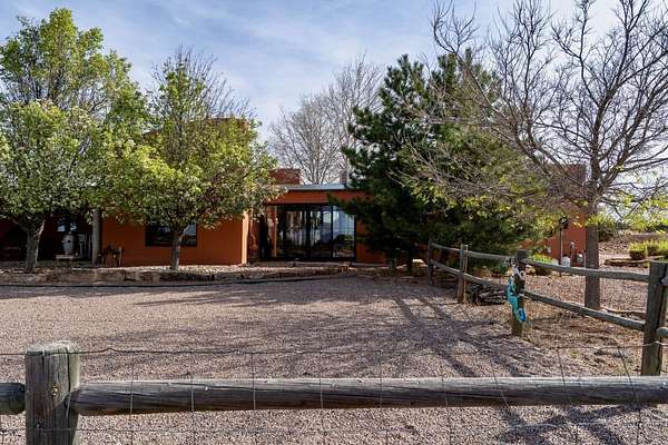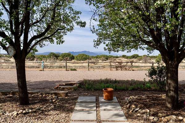 Beautifully designed and sited for privacy, this meticulously maintained contemporary home offers bright, well-proportioned spaces on more than 3 acres. Bordered on two sides by greenbelt, the property enjoys open views of the Sangre de Cristo and Sandia Mountains and a peaceful setting less than 20 minutes from Santa Fe. The house features high ceilings, an open floor plan, and no interior steps, creating an easy sense of flow and livability throughout. A rare 4-car garage adds exceptional flexibility for vehicles, storage, or hobbies. Mature landscaping creates several garden oases, enhancing the beauty and serenity of the setting while reinforcing the home's sense of seclusion. Combining quality design, generous space, natural light, and sweeping mountain views, this property offers a rare opportunity to enjoy privacy and comfort with convenient access to Santa Fe's dining, shopping, and cultural amenities.