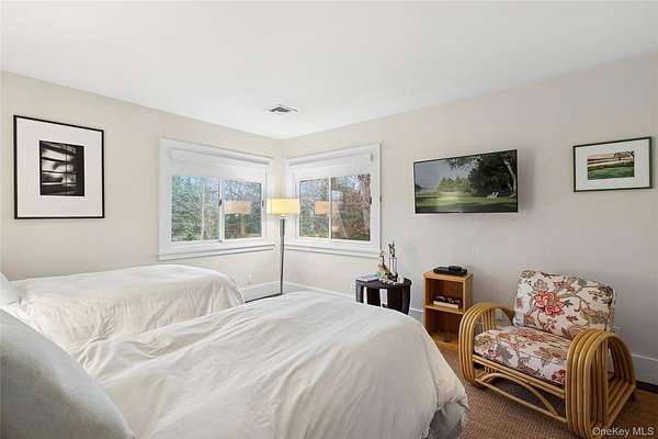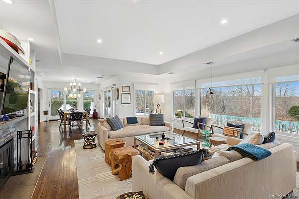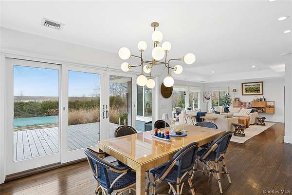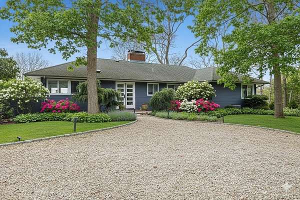 Breathtaking Sunset Views. Summer sunsets from your west-facing hilltop perch across the street from the multiple marinas edging the tranquil waters of East Hampton's world-famous Three Mile Harbor. Professional chef's kitchen with oversized stainless-steel commercial stove and huge refrigerator - this kitchen must be seen. Trust us; if you are a serious cook, you cannot live without this irreplaceable space. Designed for those who love to cook, gather, and entertain with ease, this home offers a setting that naturally brings people together. Evenings here are defined by glowing sunsets, open conversations, and effortless indoor-outdoor living. At grade, three bedrooms and two bathrooms on the main level, plus an additional bedroom and two full bathrooms on the walkout finished lower level, along with a dedicated gym area. Even the heated swimming pool enjoys water views. Dramatic, parklike grounds spanning nearly two and a half acres are graced with towering oaks. Outdoor amenities include an outdoor shower, expansive stone patio, and beautifully landscaped grounds with extensive stonework. A second storey added to the existing structure would elevate an already lovely view into something truly cinematic. Plenty of room for expansion and additional structures. The Village of East Hampton and Maidstone Beach Park are both less than three miles away.