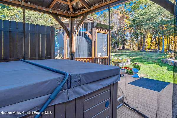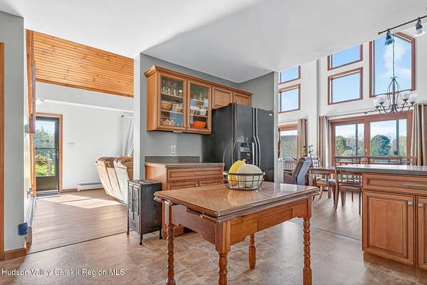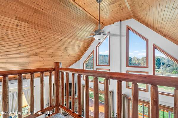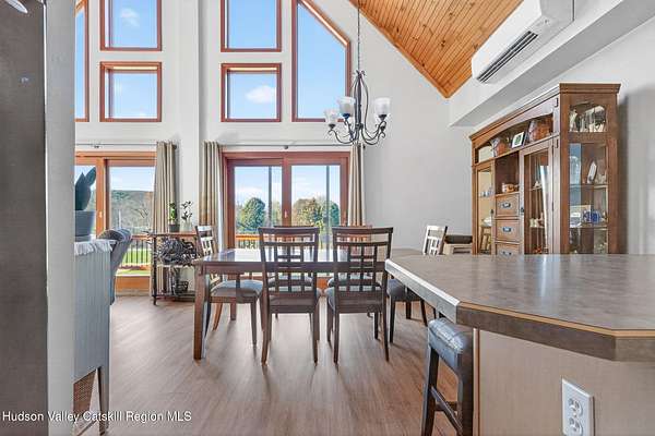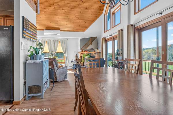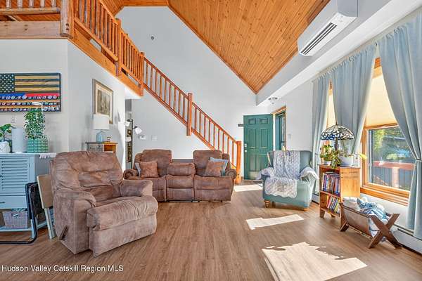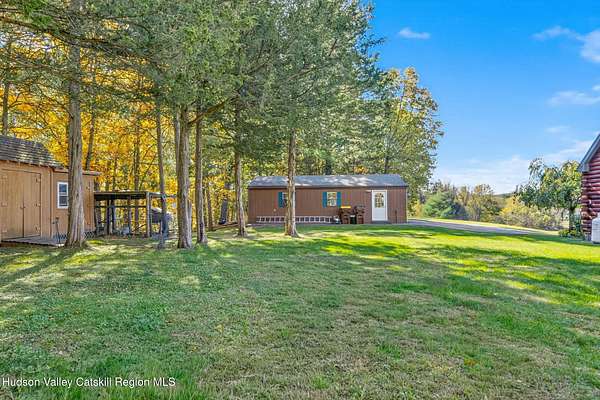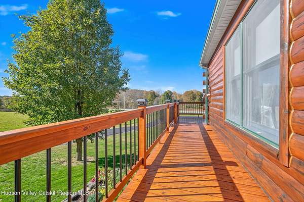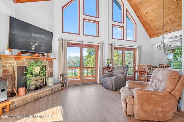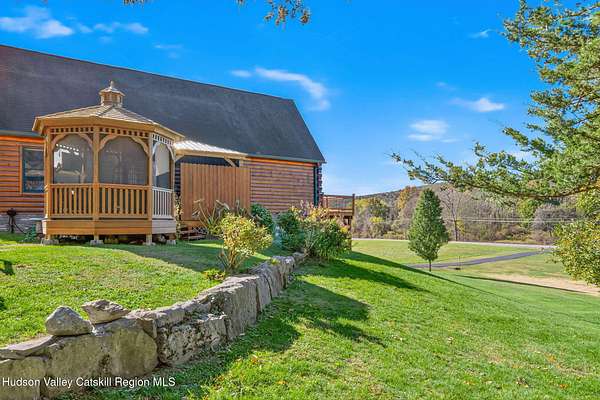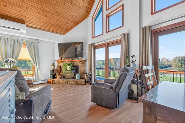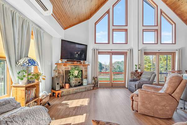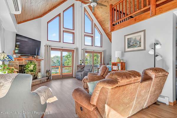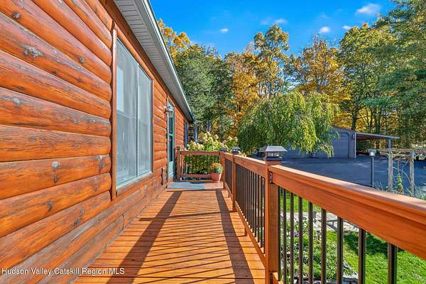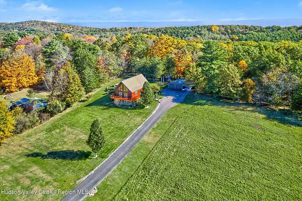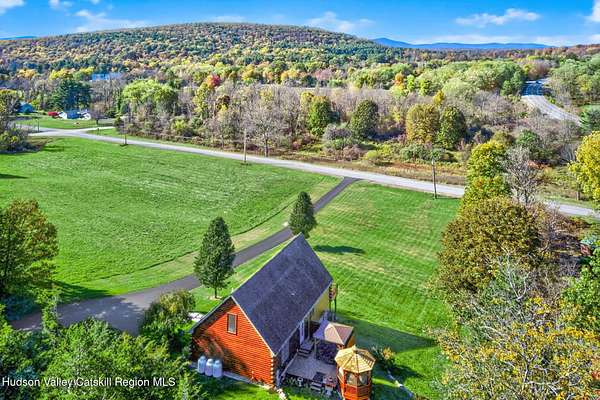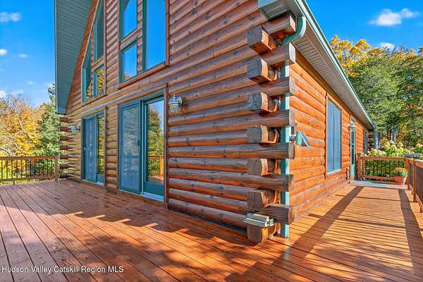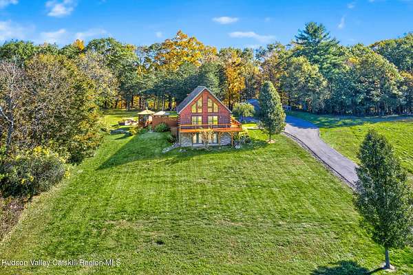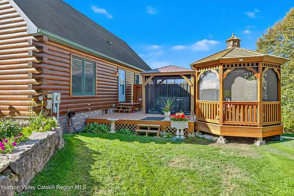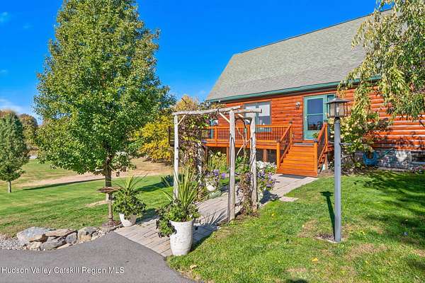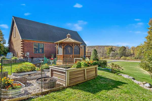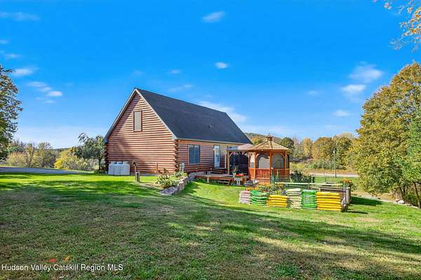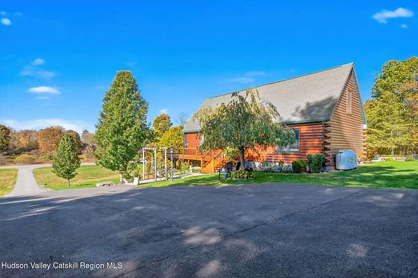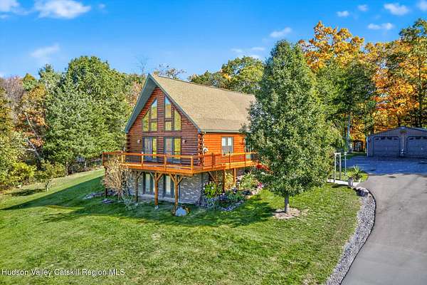 OPEN HOUSE SUNDAY 10/26 FROM 12 TO 2 Set high on a private 2.7-acre lot, this beautiful log-sided chalet offers stunning natural light and peaceful country living just minutes from the heart of Coxsackie. The open-concept living room features a cozy fireplace with a pellet insert and a dramatic wall of windows and sliding doors that bring the outdoors in and frame the surrounding views. A well-appointed kitchen and separate dining room make entertaining easy and enjoyable. The main level also includes two comfortable bedrooms, a full bath, and a convenient laundry/mud room located off the rear deck-perfect for everyday living. Upstairs, you'll find a bright loft ideal for a home office, along with the spacious primary bedroom and ensuite bath. The expansive lower level, warmed by a propane heater, offers endless possibilities for additional living space-ideal for a family room, guest suite, game room, or workshop. Outdoor living shines here with a welcoming front porch overlooking amazing views, a large back deck with a hot tub, a gazebo, raised garden beds, and a generous 2+ car garage with an attached carport. There's even a charming chicken coop! Enjoy the tranquility of your own private retreat while still being just minutes from local shops, restaurants, and the Hudson River.