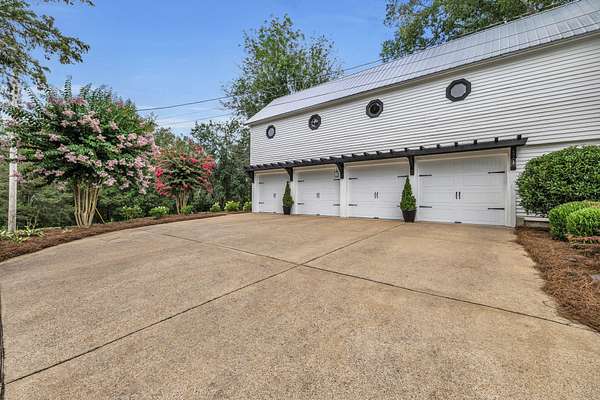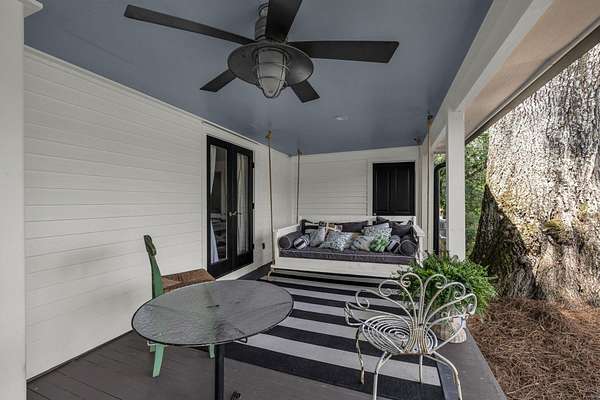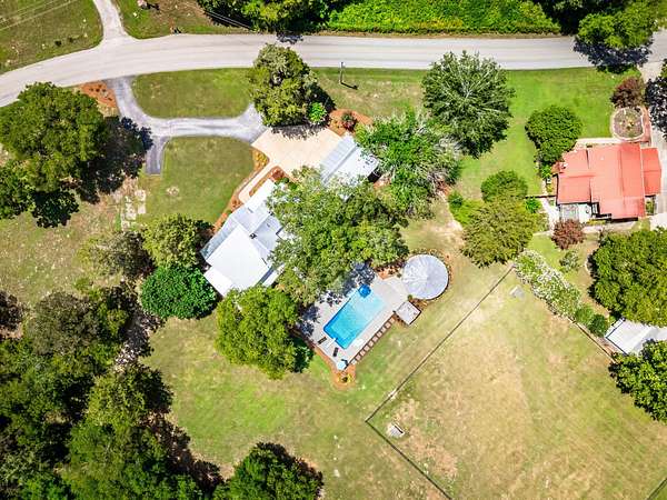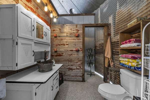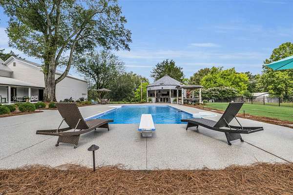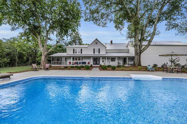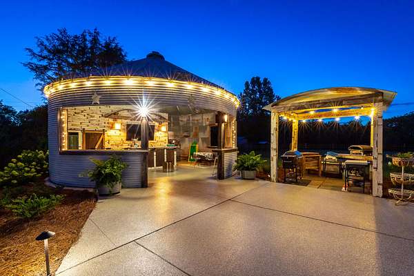 Step outside and you'll see that the charm continues. A new metal roof tops the home, and epoxy-coated surfaces keep the porches, garage, and pool area fresh and clean. The inground pool is ready for summer days, complete with a converted grain bin pool house featuring its own kitchenette and full bath. There's also a covered grilling area, a wrought iron fenced backyard, and an oversized driveway leading to a four-car garage, perfect for guests, hobbies, or extra storage.