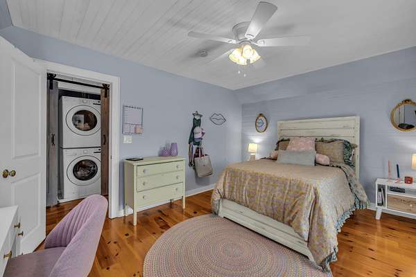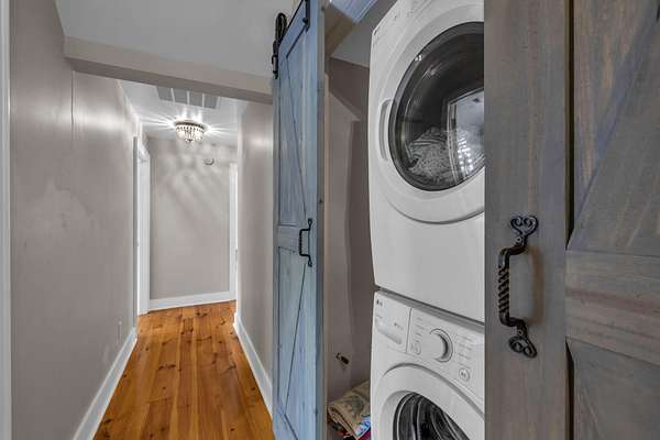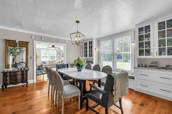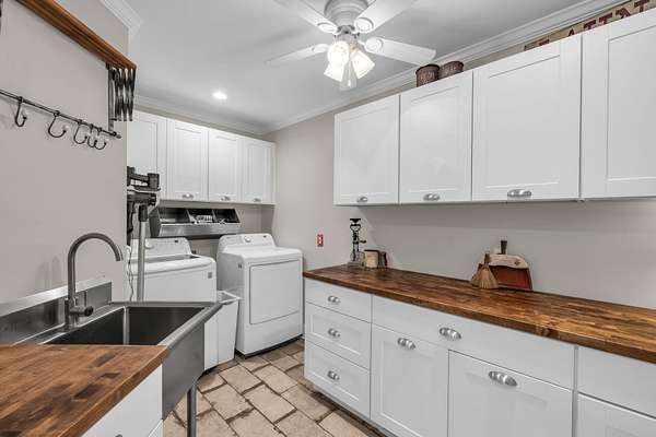 At the heart of the home, the kitchen is where everyone will naturally gather. Outfitted with new stainless steel Bosch appliances, double ovens, and granite countertops, it's both beautiful and functional. The furniture-style cabinetry adds that farmhouse character you love, and just off the kitchen, the oversized pantry and laundry room add extra storage and workspace, complete with butcher block counters and a tankless water heater.