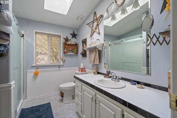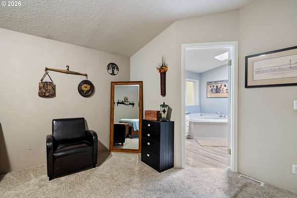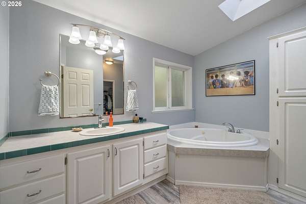 - Ceiling Fan, High Ceilings, Jetted Tub, Laminate Flooring, Laundry, Skylight, Tile Floor, Vaulted Ceiling, Wainscoting, Wallto Wall Carpet