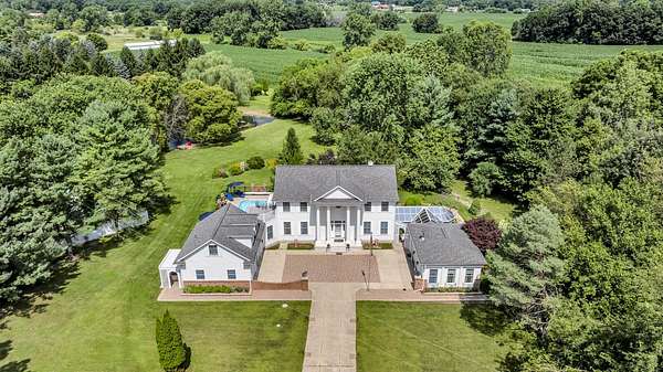 Custom-built two-story colonial situated on a serene, beautifully landscaped 4.7-acre parcel. Featuring over 3,800 square feet of above-grade living space, this 3-4 bedroom, 2.5 bath home offers a versatile floor plan spread across two levels. The first-floor features formal and informal dining areas, living room w/dual-sided fireplace, sun-filled, heated solarium, family room with wet bar and wood-burning stove (could be converted to primary bedroom if desired), an updated kitchen with granite counters and stainless-steel appliances, and powder room off the two-story foyer. The second level boasts a primary suite featuring a walk-in closet, en-suite bath, and access to an elevated composite deck with stunning views of the manicured grounds. Two additional bedrooms, secondary bathroom and dedicated laundry room & craft room that is large enough to be utilized as a fourth bedroom round out the second level. A finished, stairway accessed bonus room above the garage offers additional heated living space- perfect for a home office, media room, or home gym. An enclosed porch attaches the home to the 2-car garage, which features built-in storage, drive-thru bay, and EV charging station. Exterior amenities include a heated mineral water in-ground pool with fountains, pond with fountain and waterside deck, irrigated flower beds,stick-built outbuilding with electricity and overhead door, two temporary storage structures (included), and a concrete driveway with brick paver parking area.