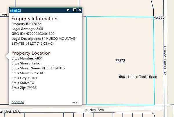 Est $2,088/moLocation, location, location. 5 Acres on Hueco Tanks Road, just half a mile from the entrance to Hueco Tanks State Park. Great opportunity for anything you might build here. There is a an existing septic system in place and the electric post is already there. On the Corner of Hueco Tanks Road and Curley. Call for details!