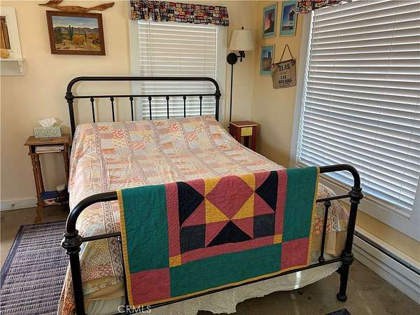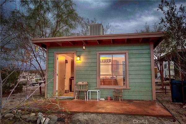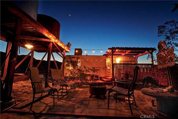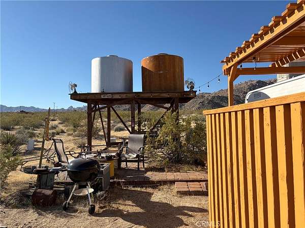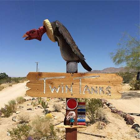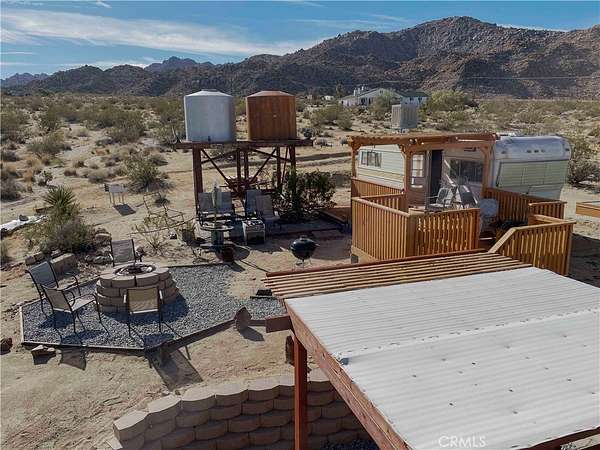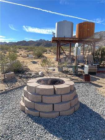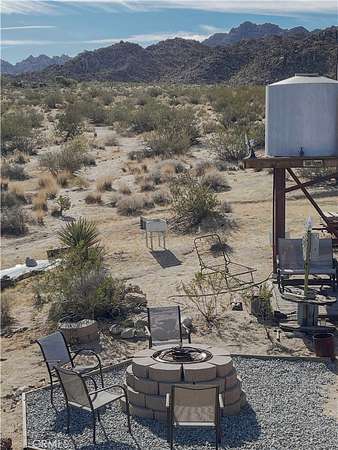 South side acreage & view property near Joshua Tree National Park! Affectionately known as "Twin Tanks" for its landmark elevated pair of water cisterns (just for looks, this property offers municipal water--already hooked up!) as well as two similarly-styled homestead cabins. The cabins are set up with the east one for sleeping and eating, the west cabin offers a bathroom with a shower. Enjoy indoor / outdoor living on this charming back patio area with fire pit--perfect setup for stargazing at night or sipping coffee at daybreak while listening to the coyotes call. After breakfast, put on your hiking shoes as this generous 5-acre parcel is a quick hop to the hiking trails of Indian Cove and the Joshua Tree National Park! Currently used as a licensed short-term rental this terrific homestead cabin property is a piece of the area's storied history. Comes furnished and ready for fun--includes a vintage travel trailer (good for storage, not currently habitable) and an old truck. Come see today!