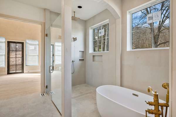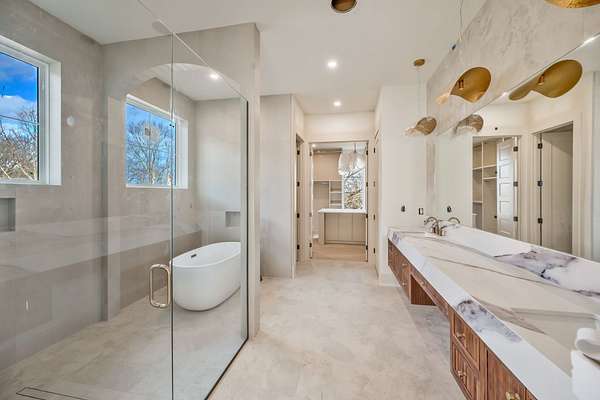 The main-level primary suite offers a spa-like retreat, while Venetian plaster accent walls add warmth and artistry throughout, including the private home office. Upstairs, a bonus room overlooks the park-like grounds, and all five bedrooms feature en-suite baths for ultimate privacy.