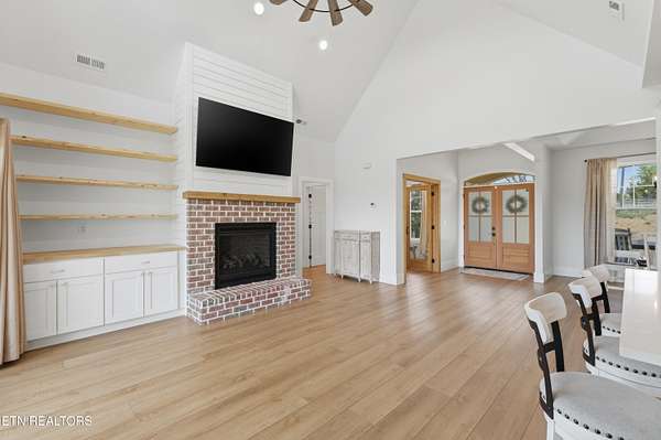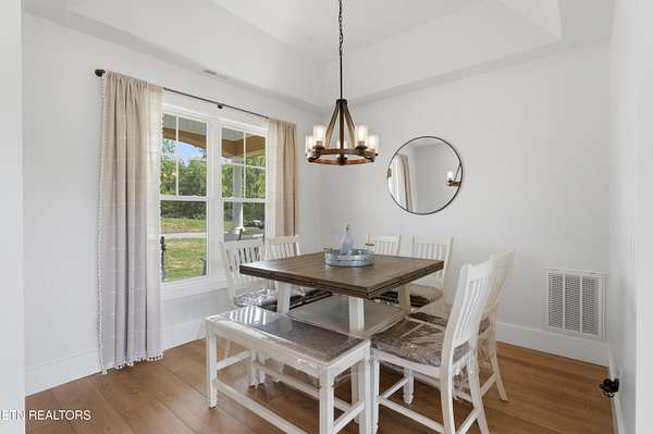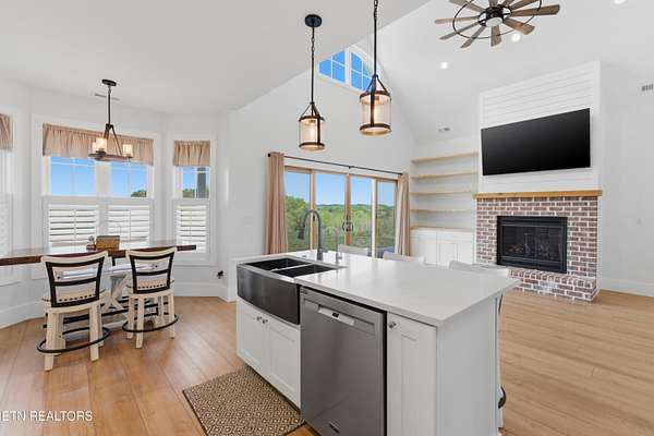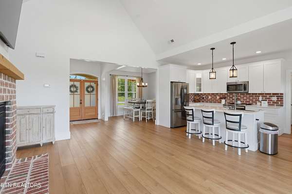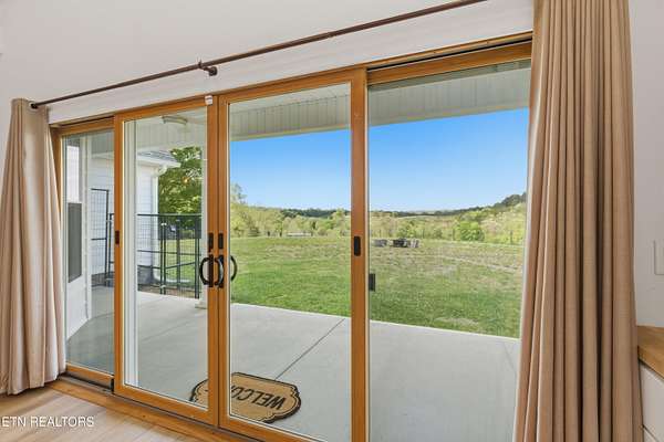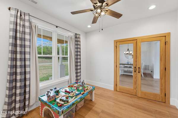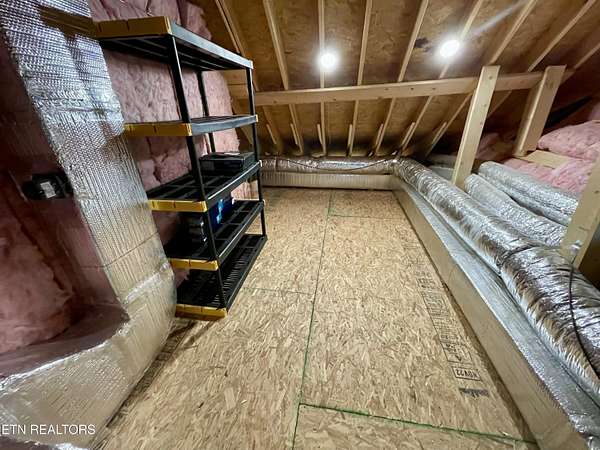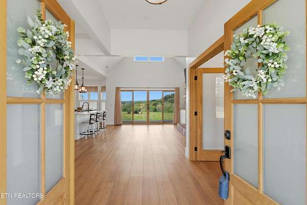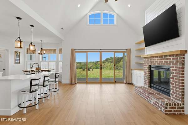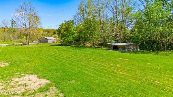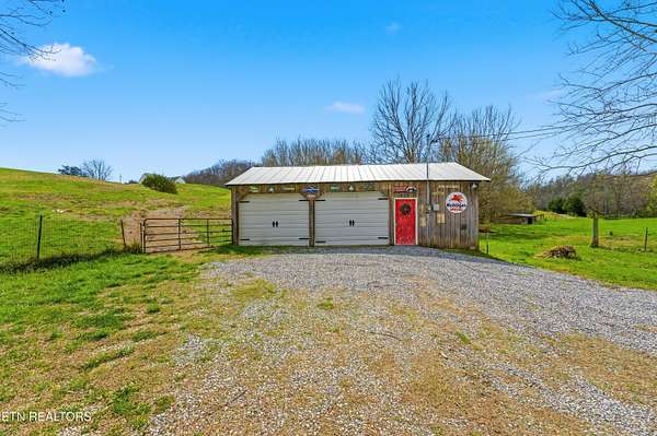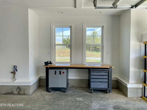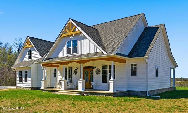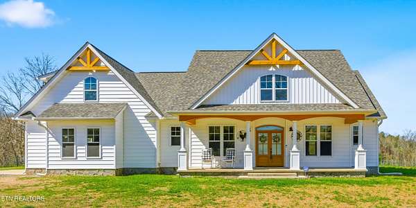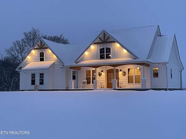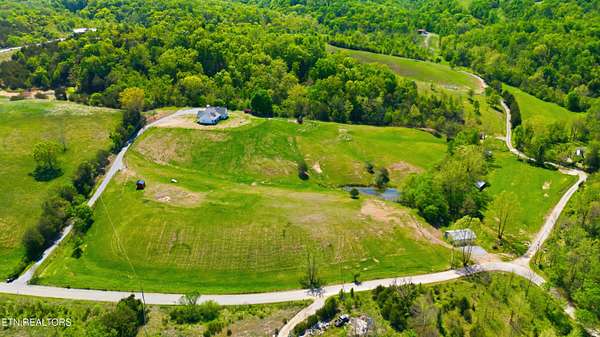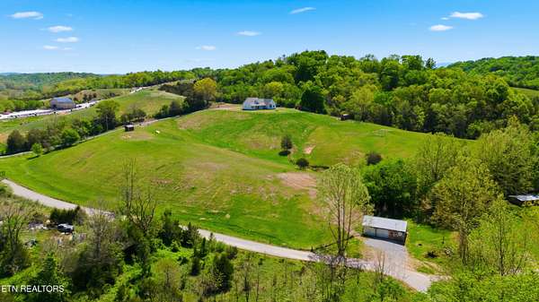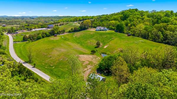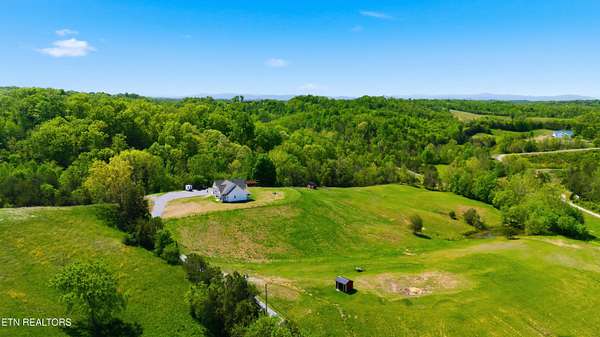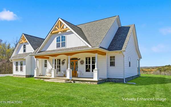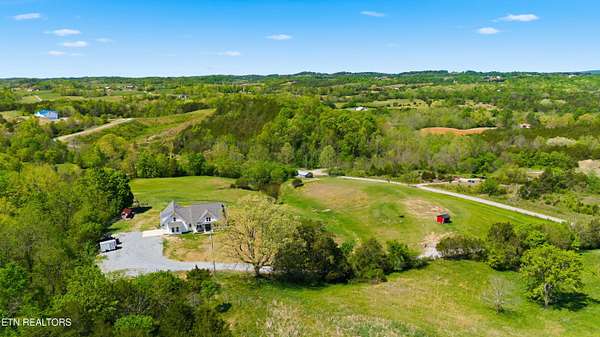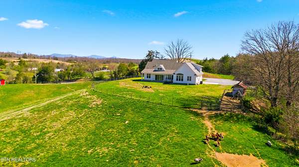 Built in 2023, this Greeneville property sits on 13.71 mostly fenced acres and offers 3 bedrooms plus a large bonus room. The great room features 16-foot ceilings, Andersen sliding windows, abundant natural light, recessed lighting throughout, and a vented gas fireplace. The primary suite includes 12-foot ceilings, skylights in both the bedroom closet and laundry area for added natural light, and a private exterior door with access to an electrical connection suitable for a future hot tub or pool setup. The en-suite bathroom is equipped with a dual shower system, including a rain shower head and a standard wall-mounted fixture. The kitchen includes a double oven and reverse osmosis water system. Additional interior features include double-pane windows, two attic storage areas, and a three-zone HVAC system with separate thermostats in the primary bedroom, living room, and upstairs. The upper level has its own dedicated ductwork for air conditioning, along with a full bathroom, large bonus room, and substantial storage space. The main level includes an attached garage with workspace and additional storage. The exterior of the home features upgraded outdoor lighting. The property includes two stocked ponds, one with a paddle boat, as well as a chicken coop and two barns. A detached two-car garage is equipped with electricity, public water, and cable access. Adjacent to the detached garage is an approximately one-acre lower pasture with an existing septic system, access to public and well water, a natural spring, and a livestock barn, offering potential for additional residential or agricultural use. Located approximately 15 minutes from downtown Greeneville, the property provides convenient access to shopping, dining, and healthcare, with travel times of about 45 minutes to Johnson City and one hour to Knoxville. This property offers a combination of newer construction and usable acreage suitable for a range of residential and agricultural needs. The grass in some exterior images have been virtually enhanced.
