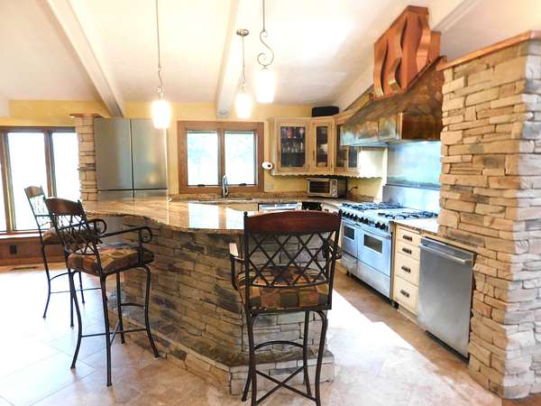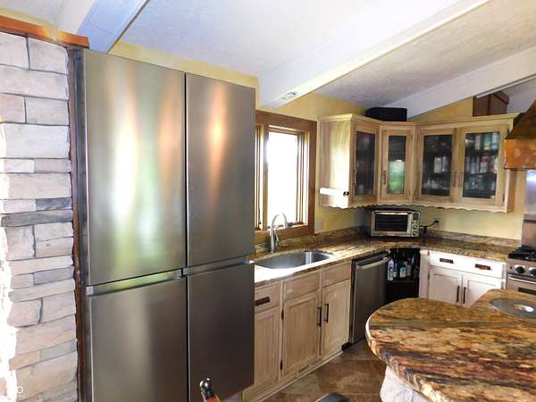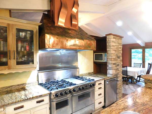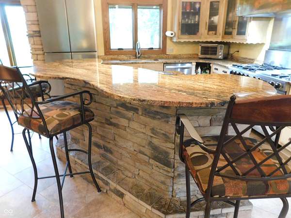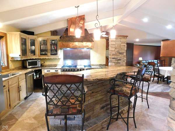 A once in a lifetime opportunity awaits a single-story residence radiating charm and boasting a great condition that is ready to be your next happy place. Adjoining the 18 hole Greensburg Country Club Golf Course. Enjoy golfing out your back door. Imagine whipping up culinary masterpieces in a kitchen designed to inspire, complete with a large kitchen island perfect for casual dining or prepping your next feast, a high-end range oven ready to handle any recipe, and a custom range hood adding a touch of bespoke flair. Stone countertops gleam under the light, complementing the shaker cabinets adorned with crown molding, while the backsplash adds a pop of personality and the kitchen peninsula offers even more space for your culinary adventures; a kitchen bar stands ready for serving up cocktails or enjoying a quick breakfast. The living room beckons with its inviting fireplace, a beamed ceiling adding rustic charm, and crown molding providing a touch of elegance, all under a vaulted ceiling that creates an airy, spacious atmosphere. Step outside and discover your own private oasis, where the patio extends your living space into the great outdoors, providing the perfect spot for al fresco dining or simply soaking up the sunshine. Surround sound inside & outside. The water view adds a touch of serenity to your outdoor living space, creating a tranquil backdrop for relaxation and enjoyment. This single-family residence offers three bedrooms, nestled on a sprawling 2.25Acre lot, representing a fantastic opportunity to embrace a lifestyle of comfort and tranquility. 2 Car attached garage Plus 3 Car Detached!!!!