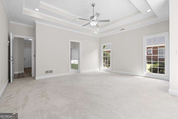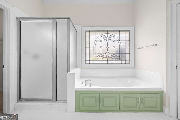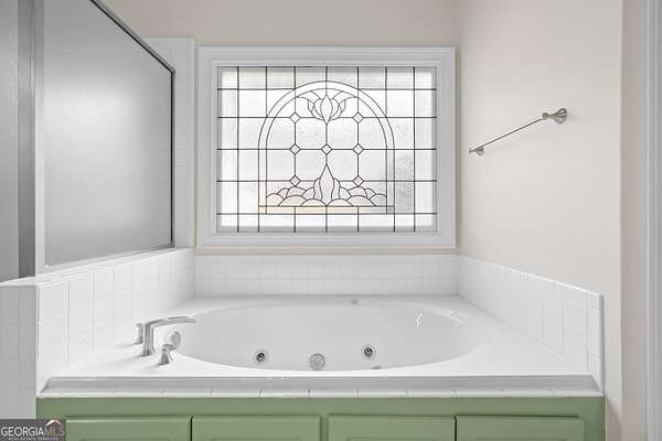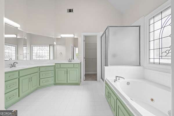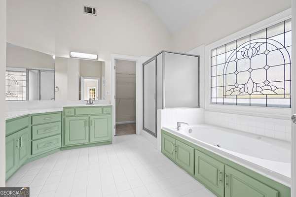 - Double Vanity, Entrance Foyer, High Ceilings, Master On Main Level, Separate Shower, Soaking Tub, Tile Bath, Tray Ceiling(s), Vaulted Ceiling(s), Walk-In Closet(s)