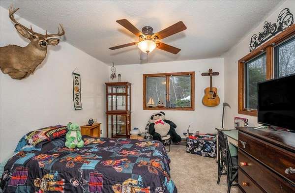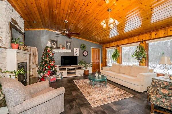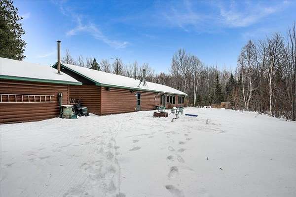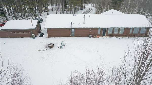 Living large!! Today you can buy a large 3 bedroom home with 8 acres of land, 3 bedrooms, 2 bathrooms, a detached and an attached garage for a fair price. This home has big details that will have you living large such as an enormous primary bedroom with a large walk in closet, great views of the woods and a private bathroom fit for a king. The living room is also huge with windows that make you feel like you are outside and surrounded by mother nature. The east wing of the house has 2 bedrooms separated by a full bathroom and a nice laundry room off the hall with a washer and electric dryer. Both bedrooms have closets, ceiling fans and tons of light through the 4 windows. There is a private dining room that is not huge, but it features a large pass through window so it feels much bigger and yet private. Outside you will find 1/2 log siding with gutters and downspouts, a nice overhang on the roof provides a covered entry area that could be a great area to hangout when the weather is less than ideal. There is a detached 20x24 garage, and an attached, finished, heated and insulated garage with a utility room and sauna. Other features include a 2000 gallon holding tank, drilled well with newer submersible pump in 2022, hardwired smoke detectors. The land is zoned Residential R2, is wooded, and very private. Internet is currently Starlink, but Spectrum is at the road and should be available. New boiler in 2025, roof in 2008. All appliances in the kitchen are matching and only 1 year old! This home will need a little TLC to bring it top the next level, but it is an amazing property for the price.