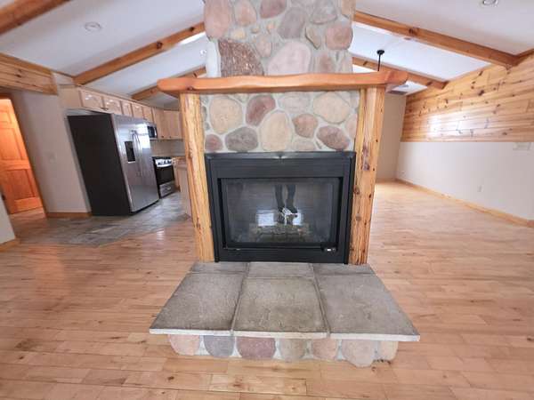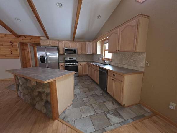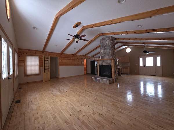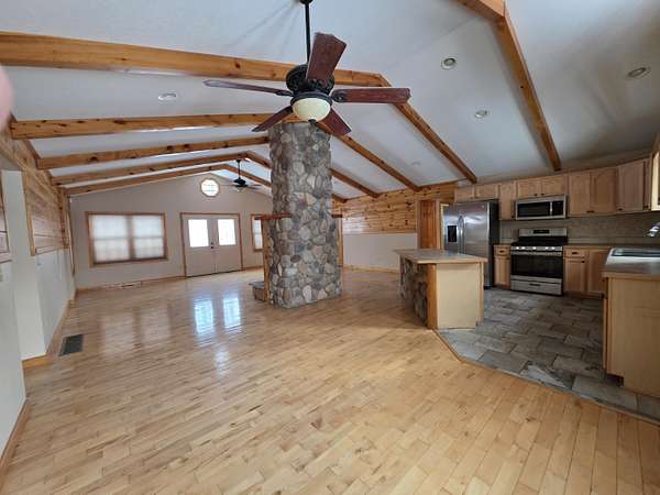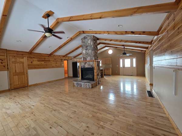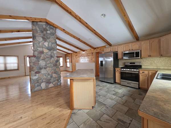 Nice Michaywe home on 1.51 acres -this ranch-style home offers the perfect blend of rustic charm and modern comfort. The open-concept floor plan features st beamed, vaulted ceilings and inviting atmosphere throughout the main living space. The custom kitchen is beautifully appointed with tiled floors, a large center island, and ample cabinetry--ideal for entertaining or everyday living. The living room showcases a dramatic floor-to-ceiling stone fireplace with natural gas, complemented by rich hardwood flooring. A main-floor primary suite and laundry for added convenience and functionality. Extra garage in the back - All offers must be submitted