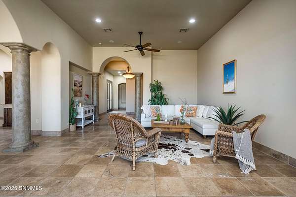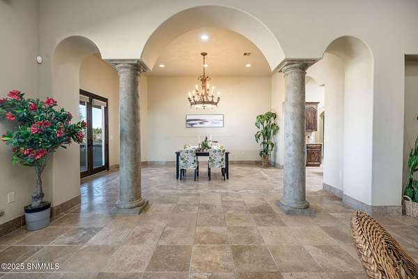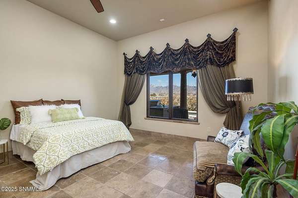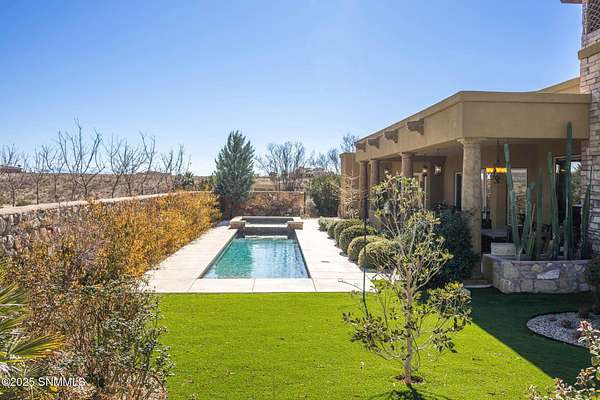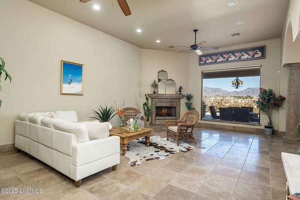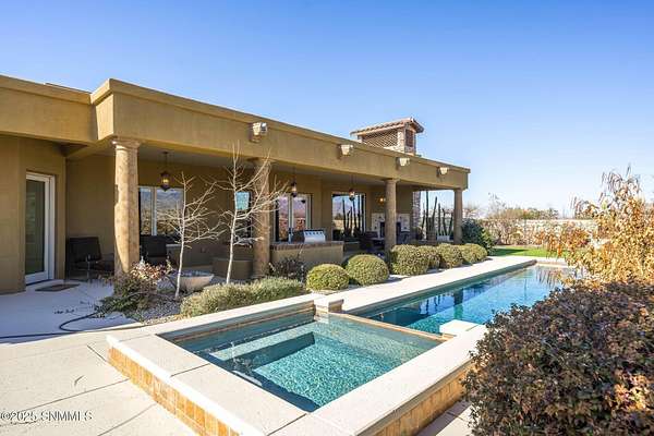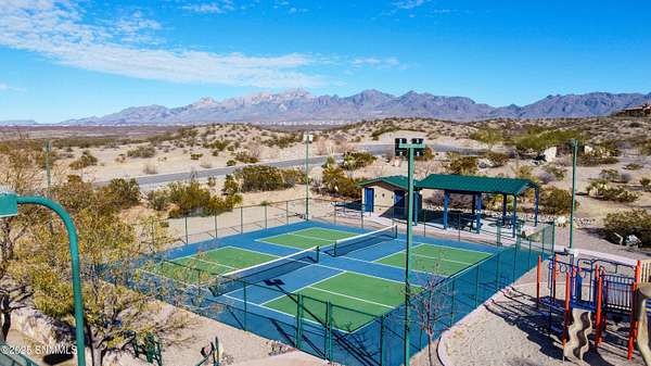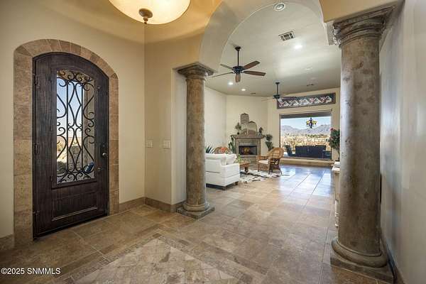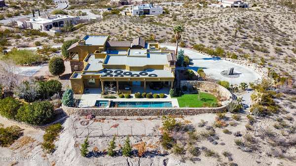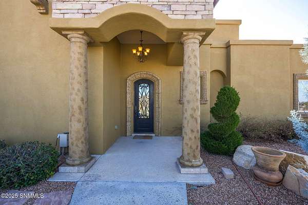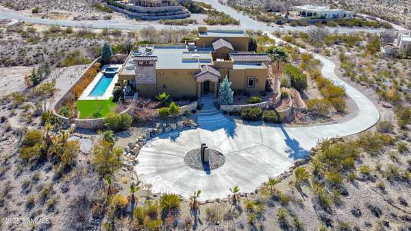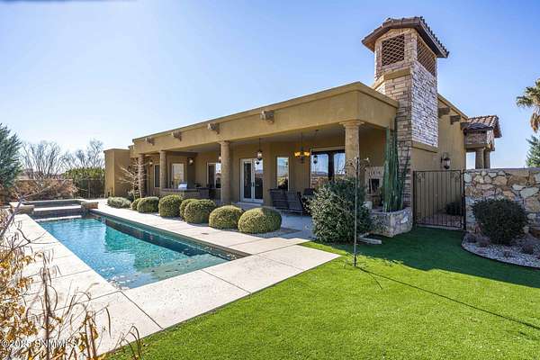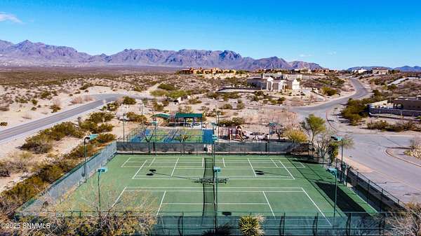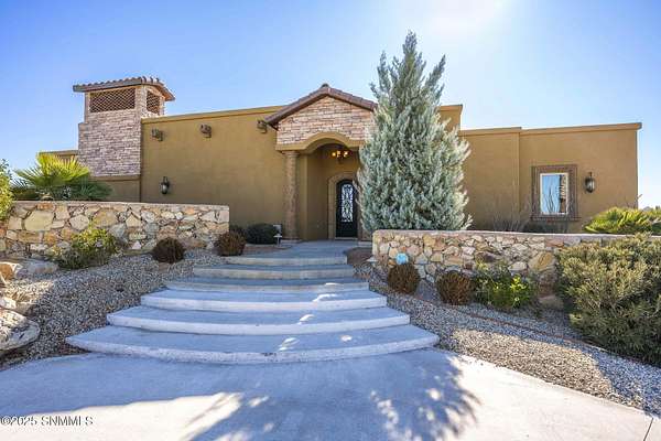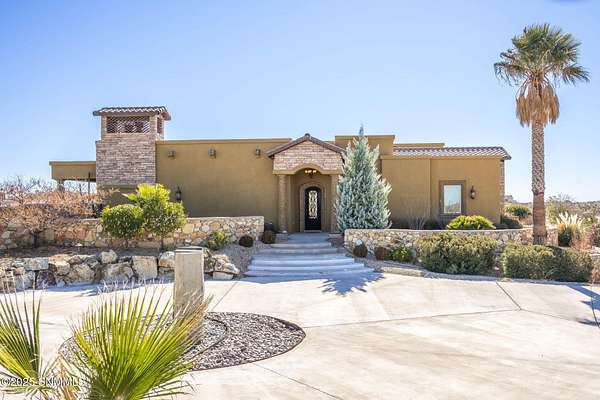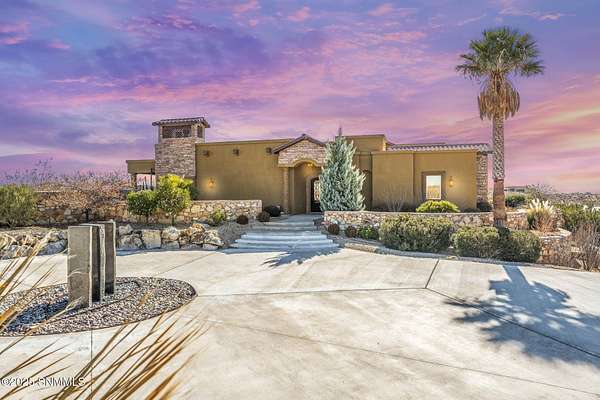 This home offers elegant living on one of the highest hills in Escondida. Large homesite with panoramic views of the Organ mountains. No detail was left out, from the talavera tile floors with tile base to the gourmet custom kitchen which includes viking appliances and custom cabinetry. All 3 bedrooms have an en suite bathroom. Primary bedroom has a flex area adjacent for a perfect home gym area or home office. The upstairs flex room can easily be another bedroom as it includes 1/2 bath and closet space. Or can be an incredible entertaining space with its large center island, sink/wet bar area and balcony. The outdoor patio features a fire place, built in grill and sink . The perfect size pool and spa all with views of the Organ mountains. Beautiful mature bushes and trees and exotic cactus surround the home in beautiful terraced gardens giving the home an oasis in the desert feel! Neighborhood tennis, pickle ball courts and playground