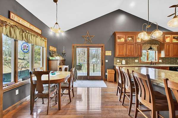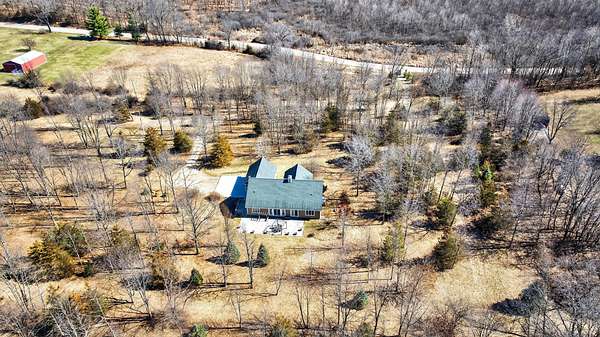 Exquisite Executive Home Built in 2008 on 4.53 Wooded Acres Tucked away on 4.53 private, wooded acres with no neighbors in sight, this elegant 4-bedroom, 3-bath custom home blends refined craftsmanship with peaceful seclusion. A beautifully stamped concrete entryway welcomes you into a light-filled, open floor plan accented by the highest quality solid hardwood floors, trim, and doors with soaring vaulted ceilings on both the main level and 9-foot ceilings in the lower level. The gourmet kitchen is a chef's dream, featuring custom cherry cabinetry with full overlay, double-thick granite countertops, top-of-the-line appliances, including a double wall oven with convection cooking, a walk-in pantry, cabinetry accent lighting, and a spacious layout perfect for entertaining. A formal dining room offers the ideal setting for gatherings, while the dedicated mudroom and laundry room off the 2-car vaulted ceiling garage provide everyday convenience. The main level includes a luxurious primary suite complete with a sitting area, a generous walk-in closet, a slider door for access to the back patio, as well as a spa-inspired bath with tiled shower, jacuzzi tub and linen closet. Two additional bedrooms and a full bath complete the main level. Downstairs, the partially finished walkout basement offers incredible potential, already featuring spray foam insulation throughout, completed wiring and plumbing, and in-floor radiant heat plumbing awaiting a boiler. The basement also includes a finished 16 x 6 bedroom with egress, a full bath, and another bedroom ready for final finishes. The basement's stamped concrete floors also feature 2 inches of insulation beneath the floor for year-round comfort. The attached two-car garage impresses with high ceilings, attic storage access, and plumbing for radiant floor heat. Enjoy serene woodland views and unmatched privacy from every angle of this remarkable property. A true retreat combining luxury, comfort, and craftsmanship in perfect harmony.
